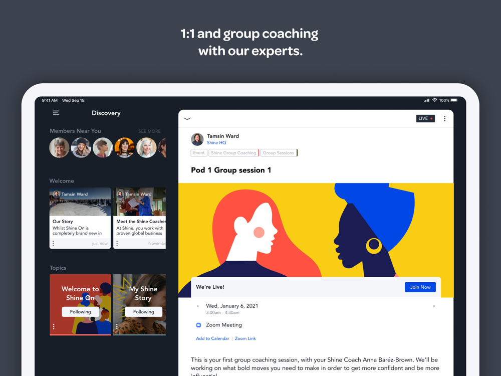 + 1:1 consultations with our expert Shine Coaches, and group coaching sessions in curated pods with like-minded women