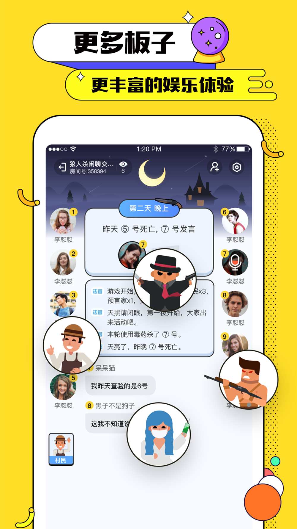 在这里,你可以体验“狼人杀”、“杀人游戏”等经典发言游戏玩法,帮你忘却生活中的种种烦闷和忧虑;你能同天南海北的小伙伴们玩在一起,边娱乐边交友,结识更多有趣的灵魂。