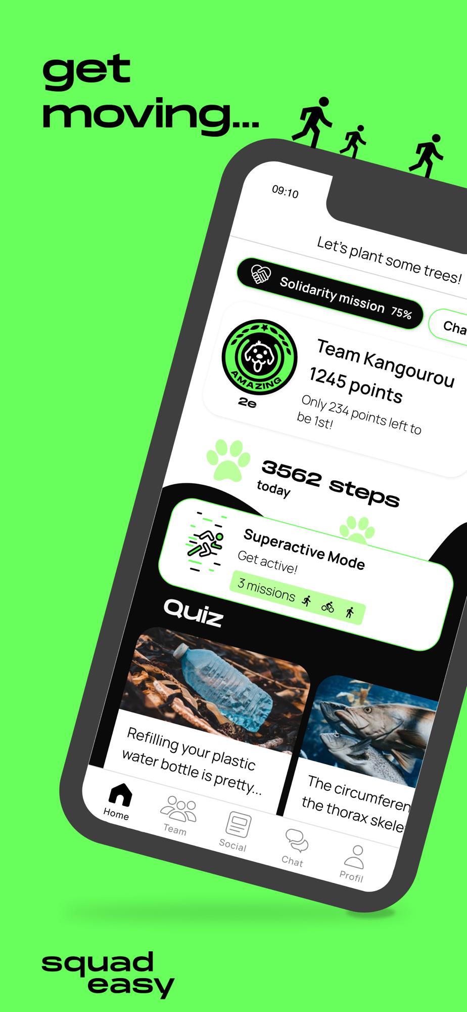 You earn points for yourself and your team by practicing a physical activity (cycling, walking, running, ...), by winning individual or team missions, by answering health and well-being quizzes and many other fun and responsible features. Yoga and other surprise activities are coming in a few weeks!