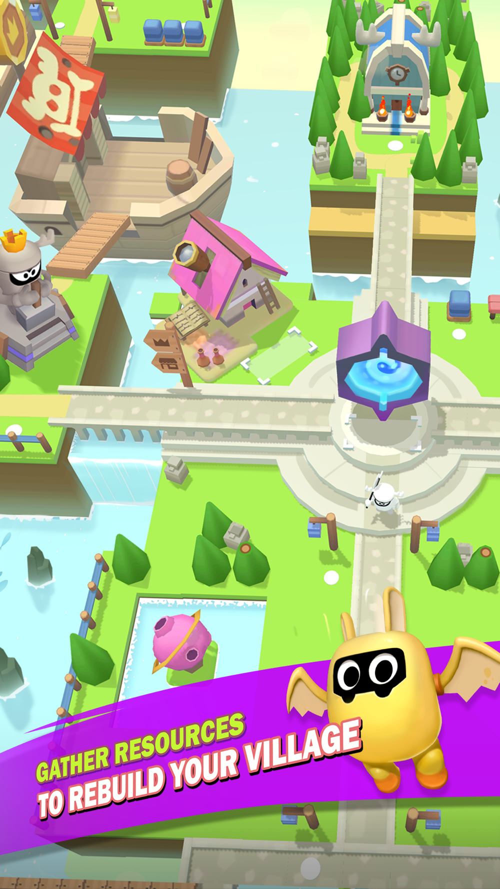 Forage wood, stone, and plants. Rebuild your village to unlock special buildings. Upgrade your tools to discover strong power-ups.