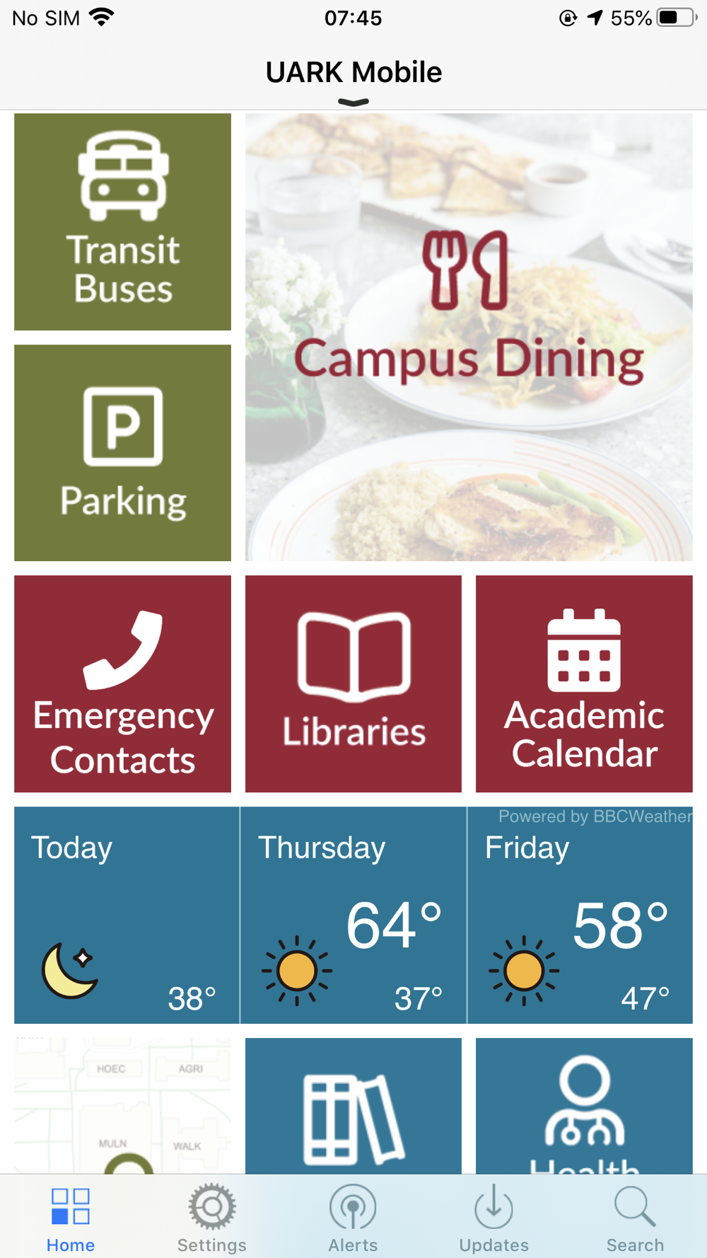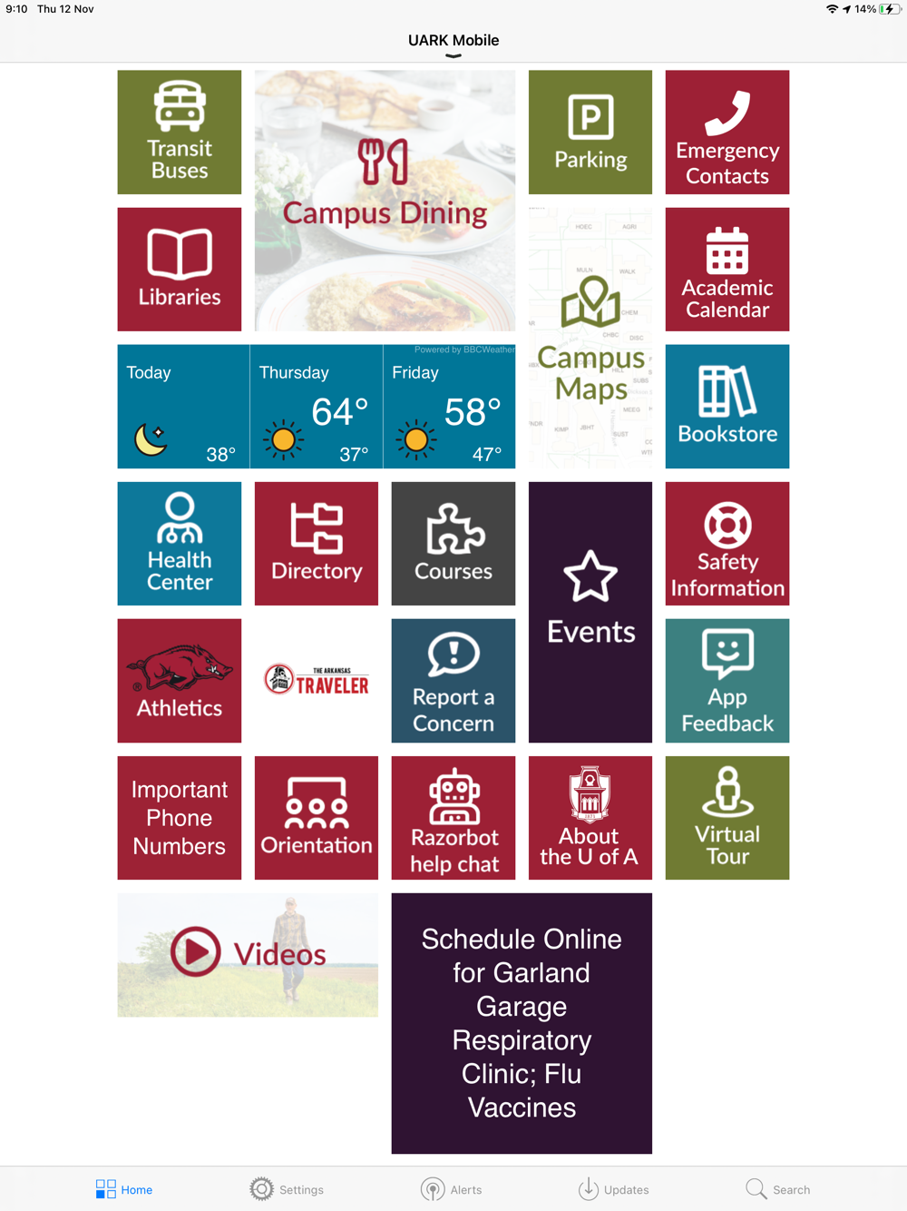 The University of Arkansas campus app provides catered content to students, faculty and staff. Perfect for the 21st century student, this app provides all vital information from class schedules, email, alerts, IT support, parking and customized campus dining options based on distance, availability and dietary needs. Download your app today and have campus resources right at your fingertips.