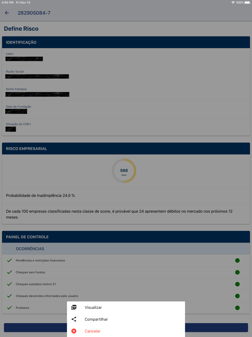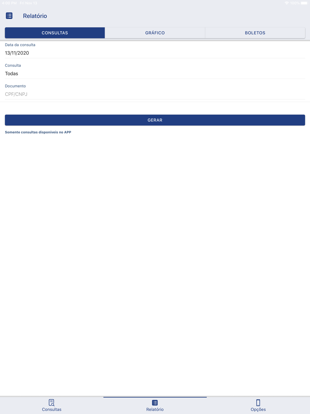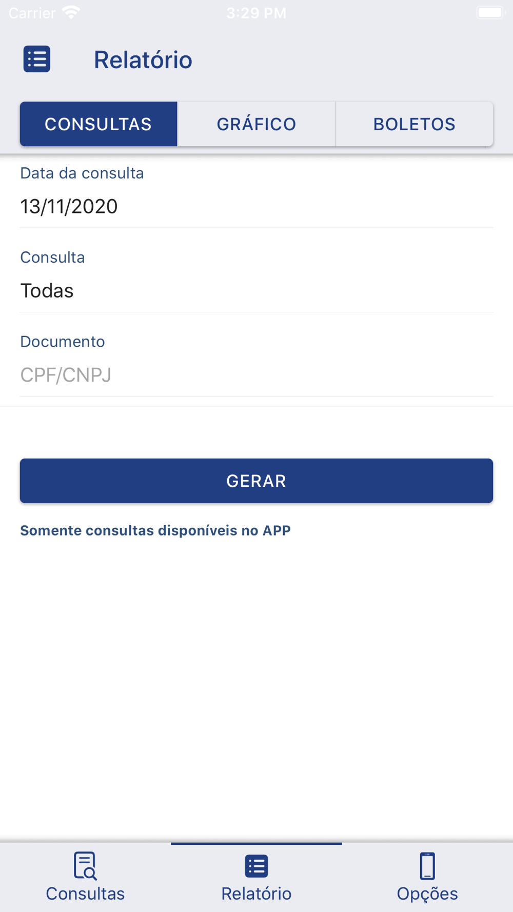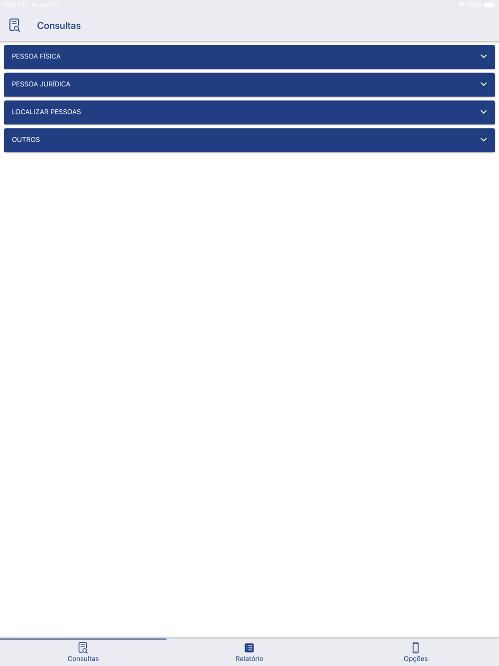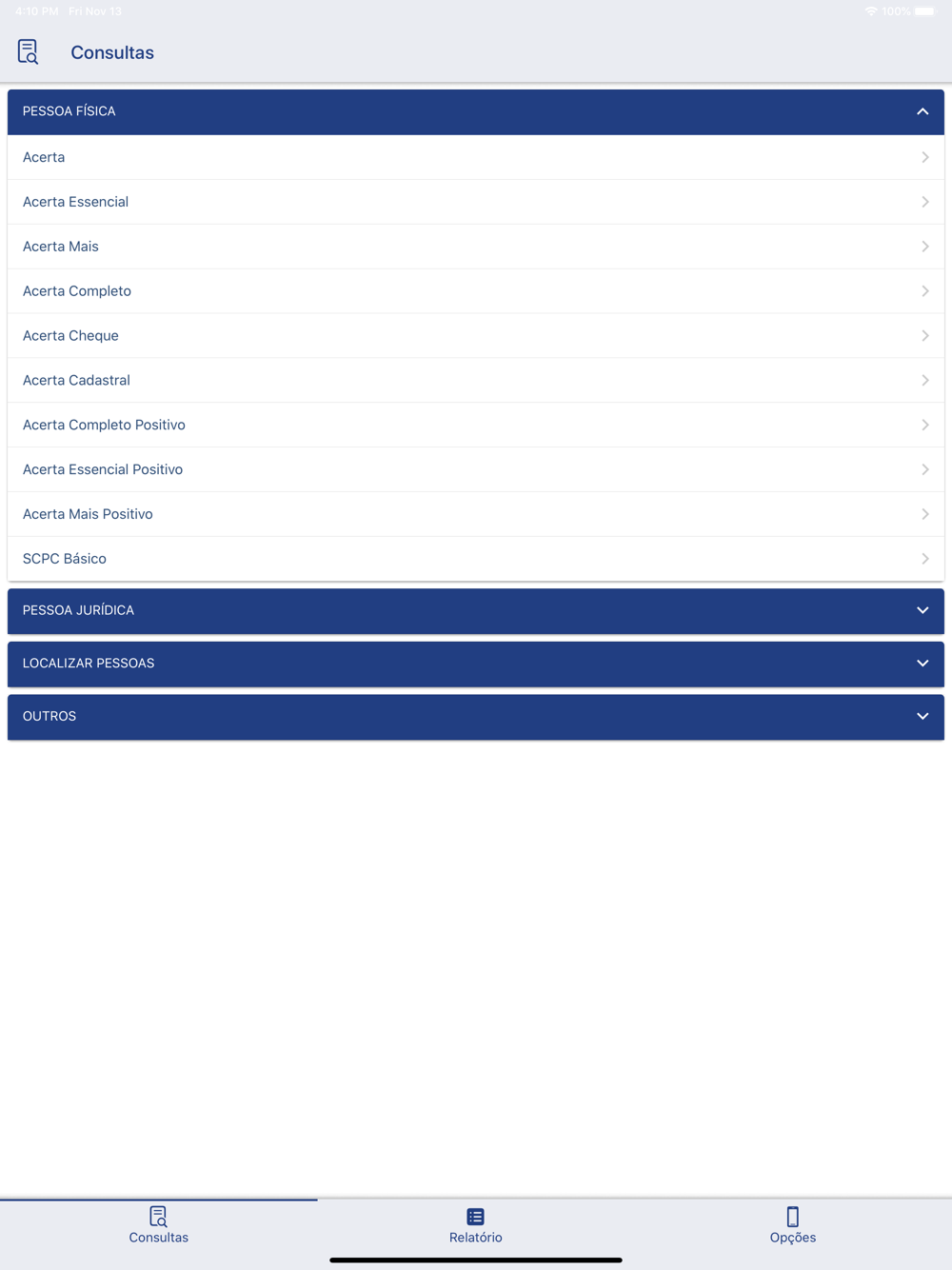 O aplicativo possui as seguintes opções de consultas: Pessoa Física, Pessoa Jurídica, Cheques e Veículos. Além dessas consultas, é possível verificar a situação cadastral na base de dados da Receita Federal de CPF e CNPJ.