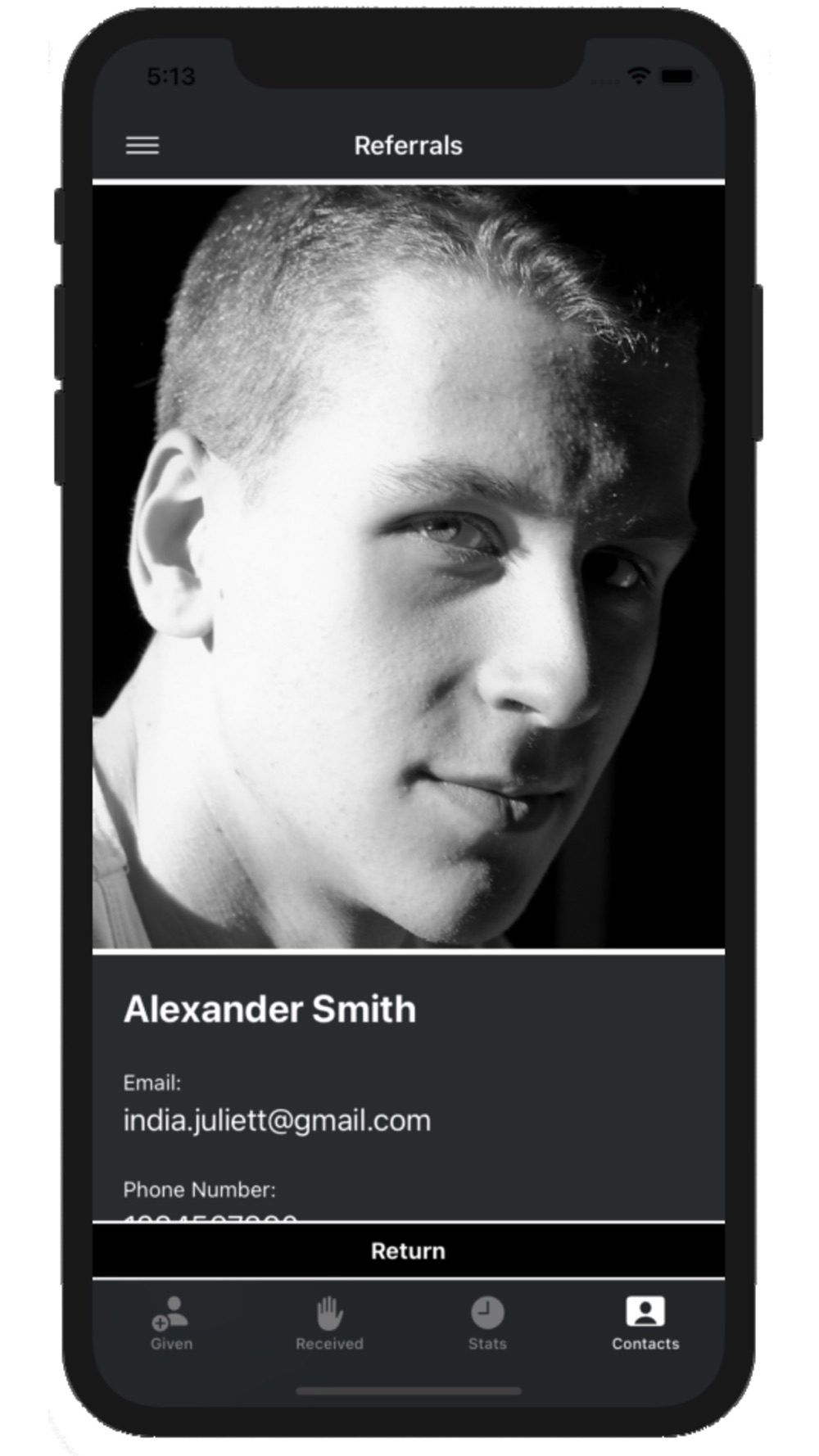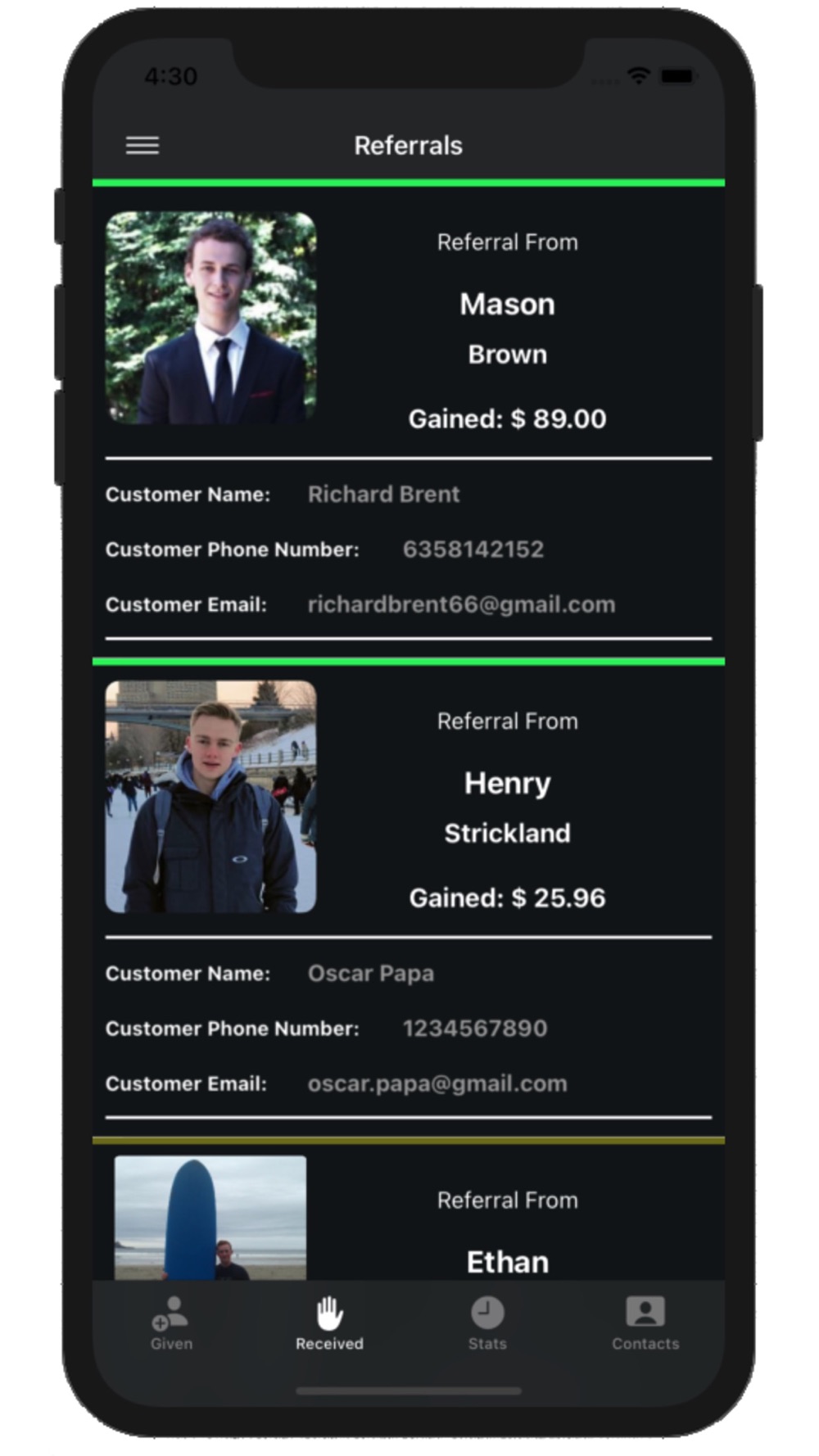 A business can record that they have given a customer referral to another business within the app. They report the customer's name or email, and once a sale is made due to the referral, it is recorded.