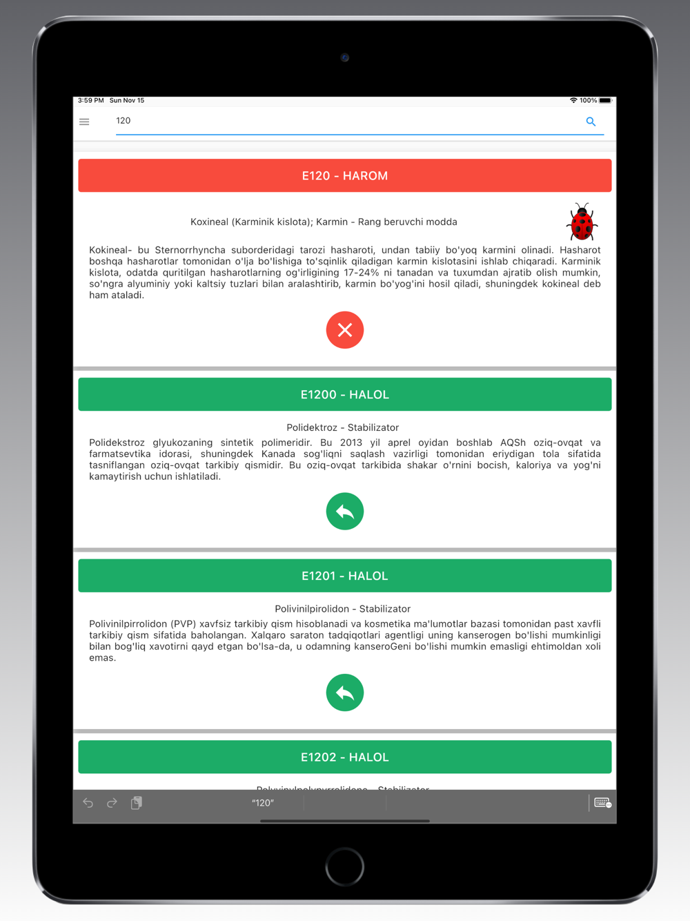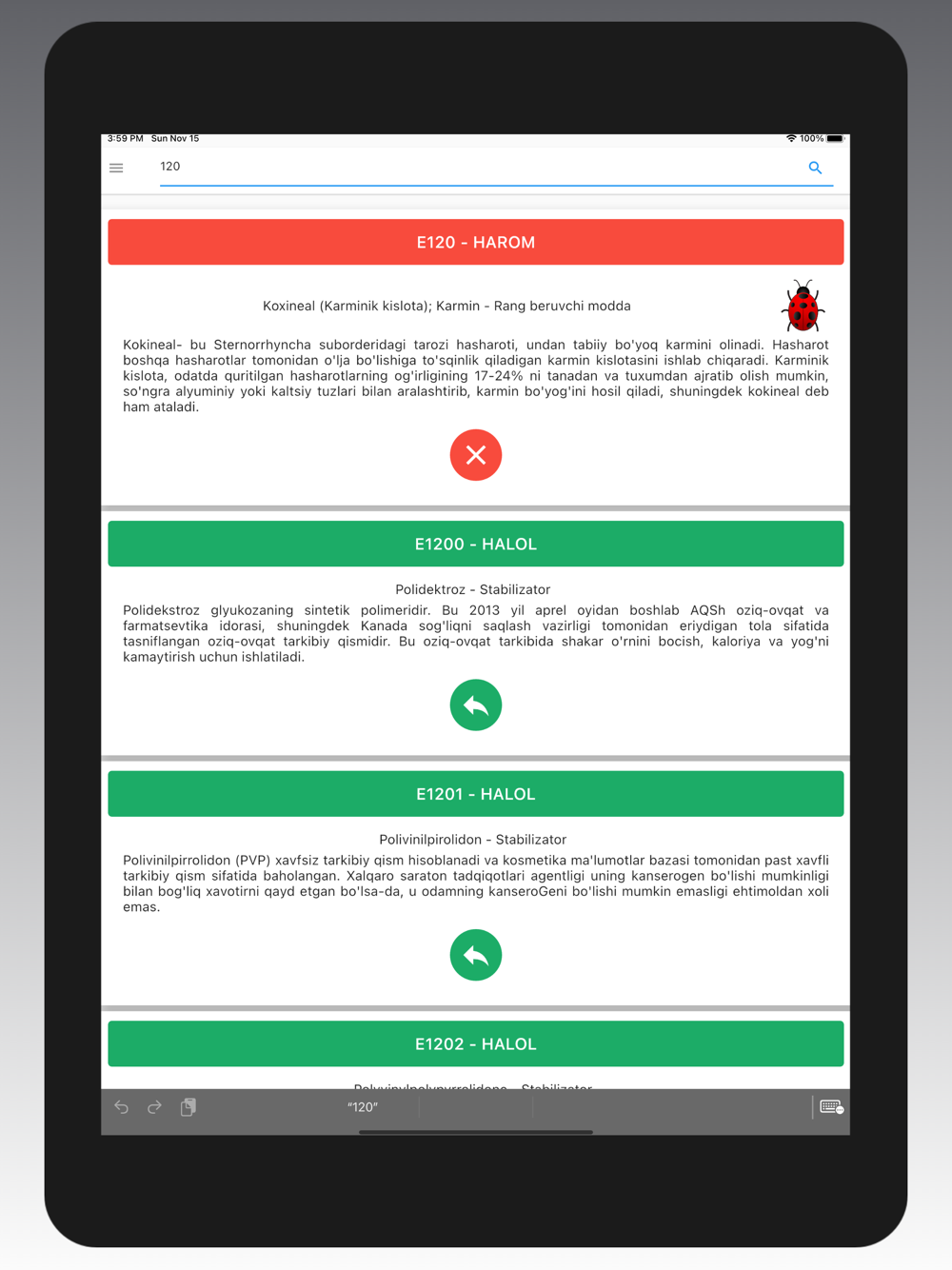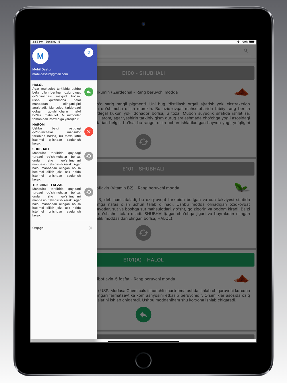 Halol tekshirish ilovasi maxsulot tarkibidagi qo’shimchalarni va E-raqamlarni halol yoki haromligini tekshirishda yordam beradi.