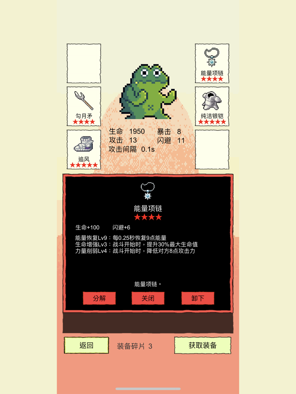 1.重大调整!现在闪避将不会完全闪掉攻击,而是将攻击伤害降为1。因此那些攻击后触发和被攻击后触发的技能将更多的发挥作用了2.新增技能[生命溢击]:每当累积回复足100血量时,对对方造成20点伤害3.修复一点小bug4.其他一些小优化