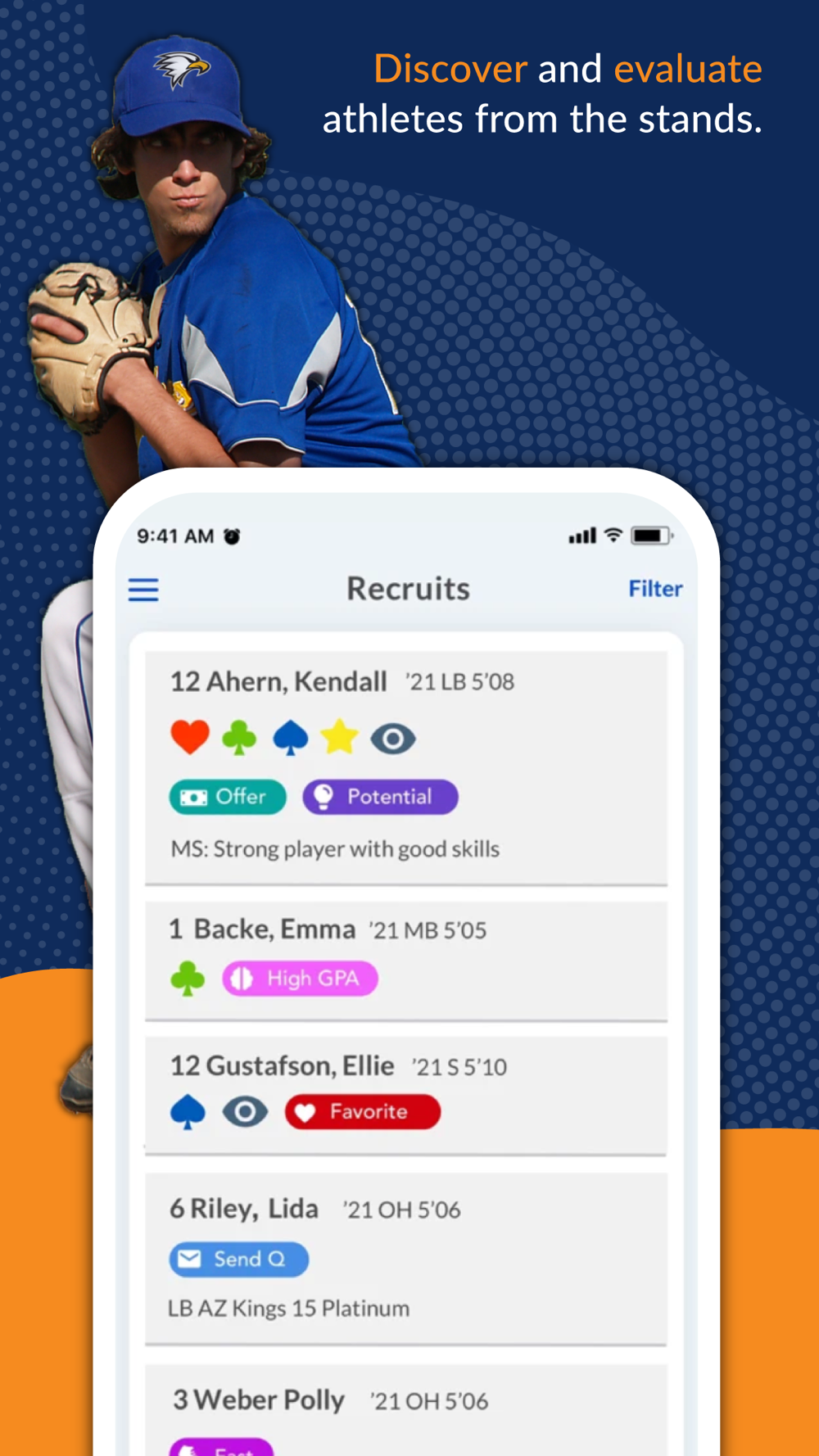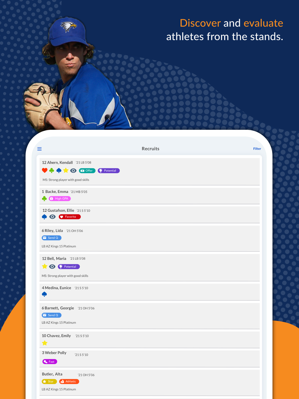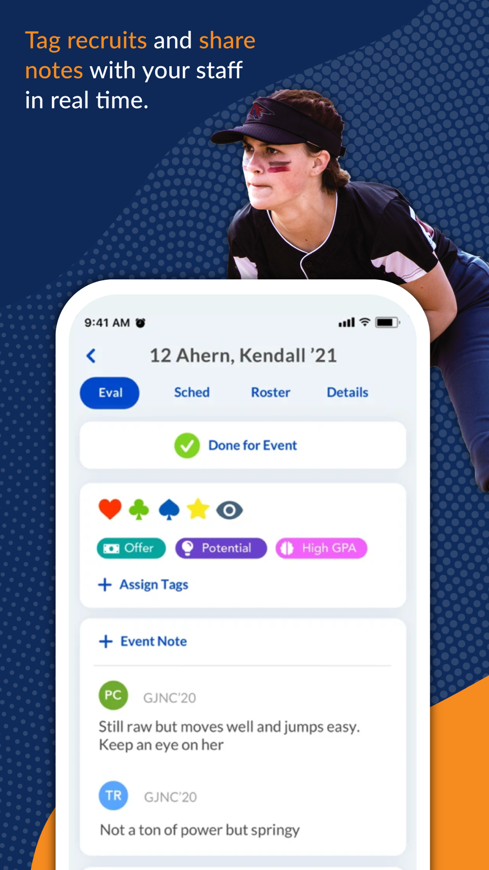 - Add unlimited custom tags with icons and coach notes for athletes you evaluate or need to evaluate