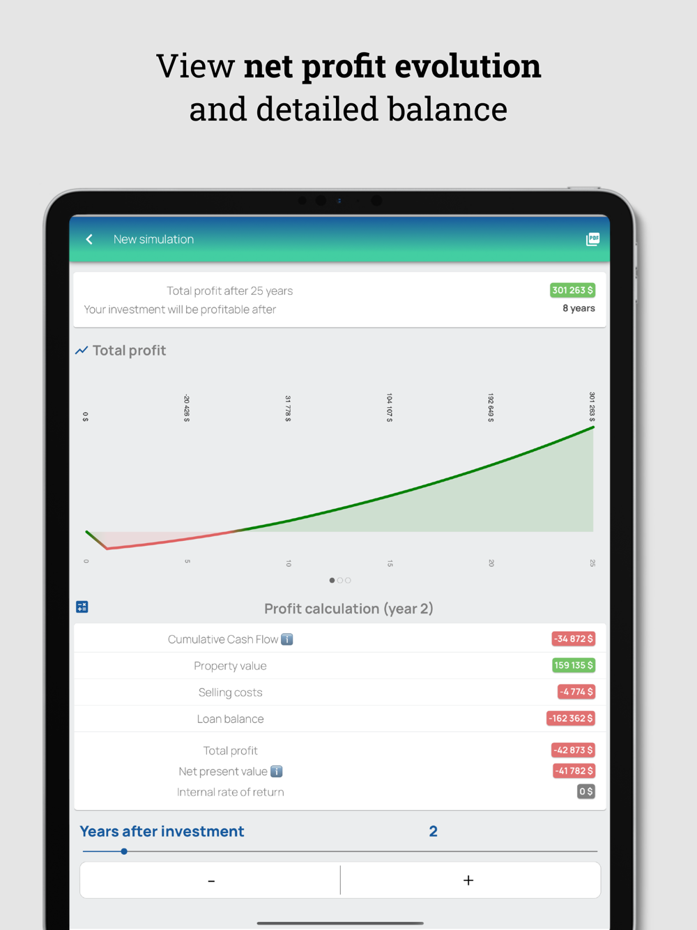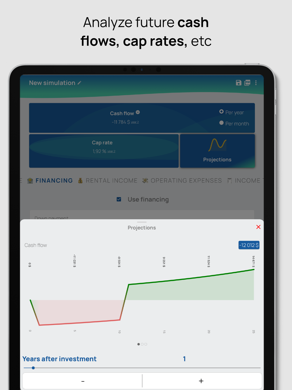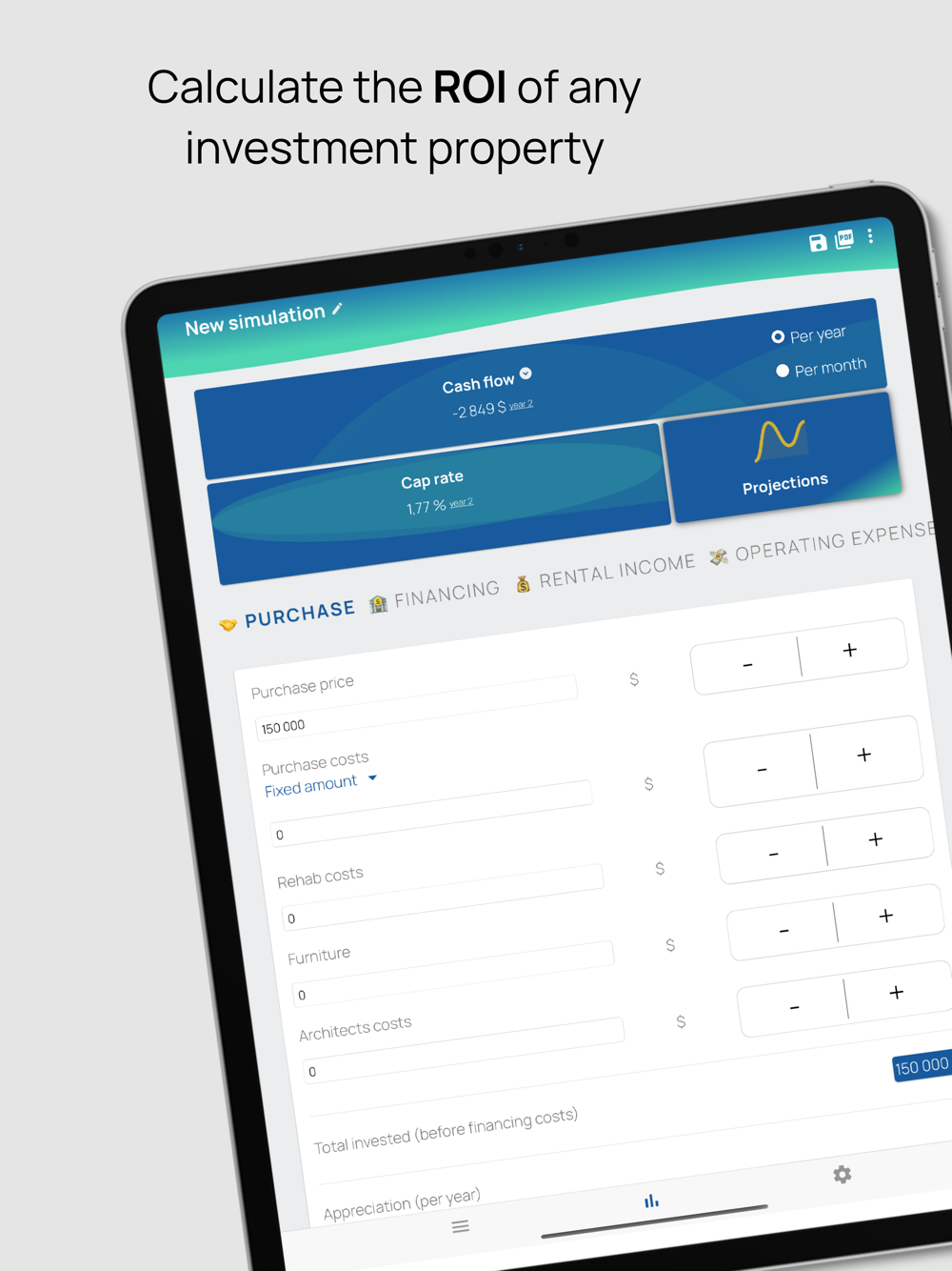 This rental calculator is user-friendly, allowing you to make real-time adjustments and see how your assumptions impact your investment's cashflow and profitability. You can use the app to track the evolution of your investments' performance metrics, including cap rate, net present value, and internal rate of return, over time.