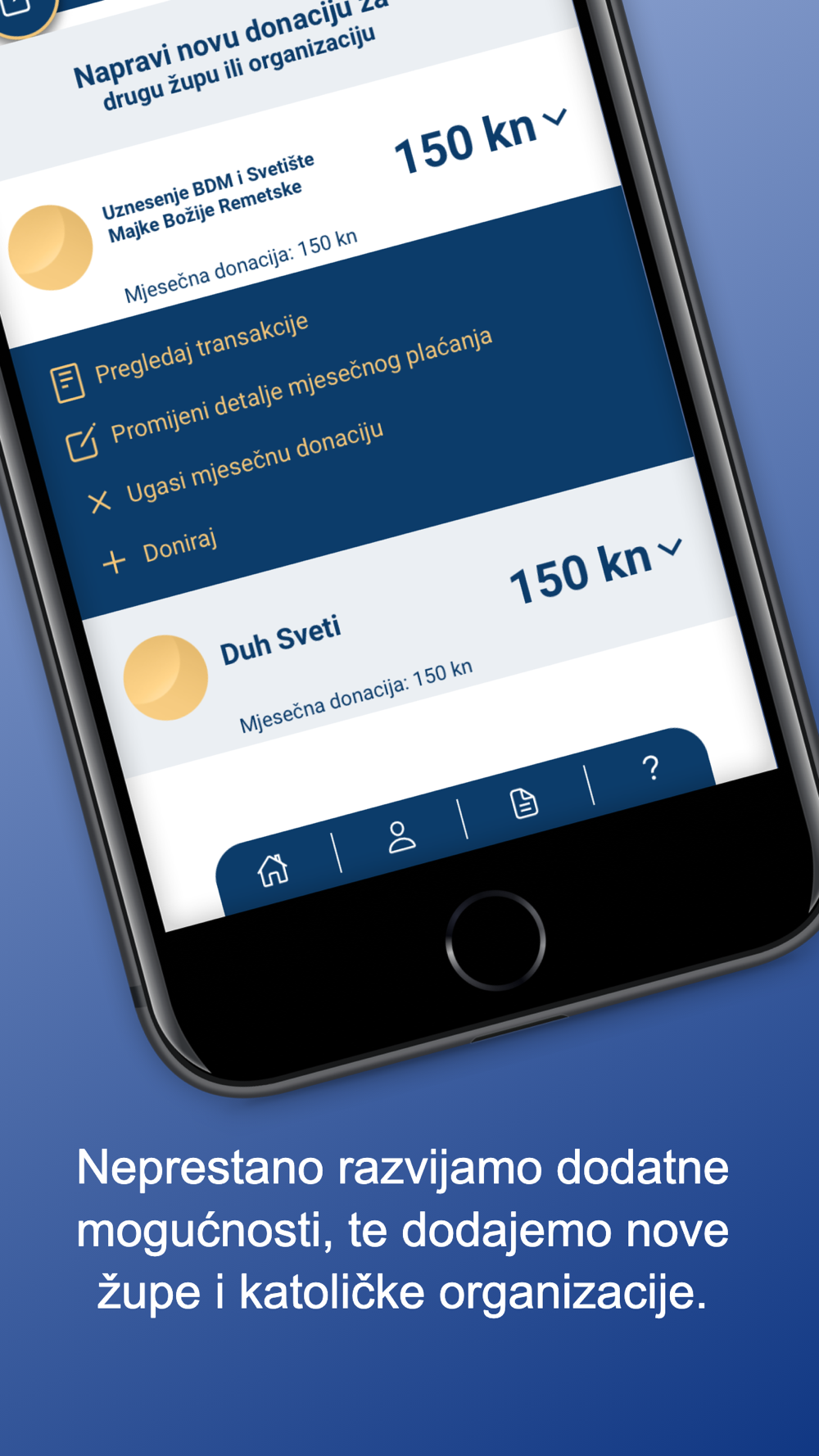 Aplikacija na brz način omugućava donacije, bilo jednokratne ili mjesečne za izabrane župe ili udruge. Unos kartice plaćanja je vrlo jednostavan i nije potrebno za svaku novu transakciju ponavljati cijeli proces ispočetka.