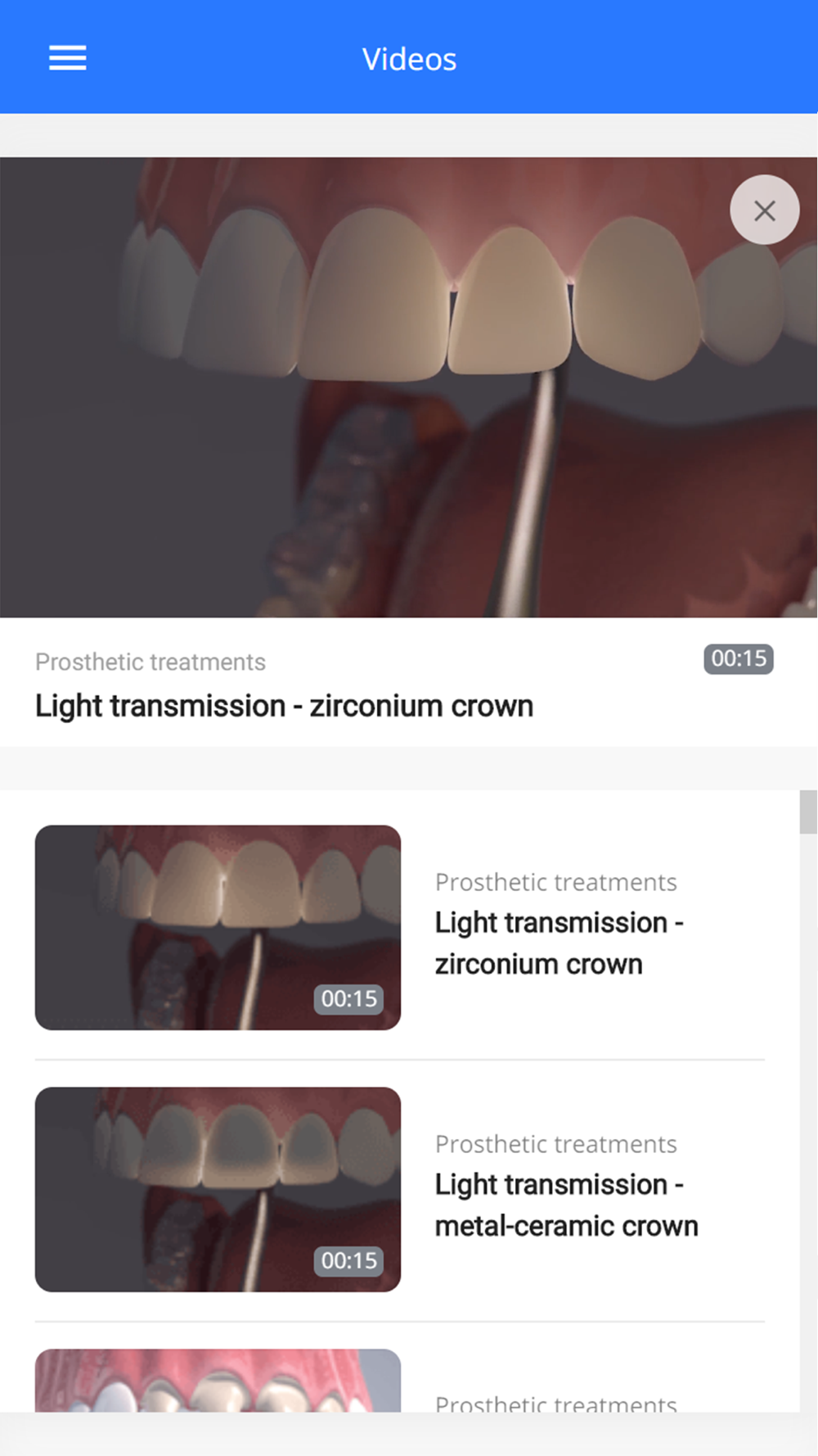 Impress your patients with never-before-seen patient education videos! These dental videos come very handy during explaining the difference between the light transmission of different materials or presenting the steps of a root canal treatment.