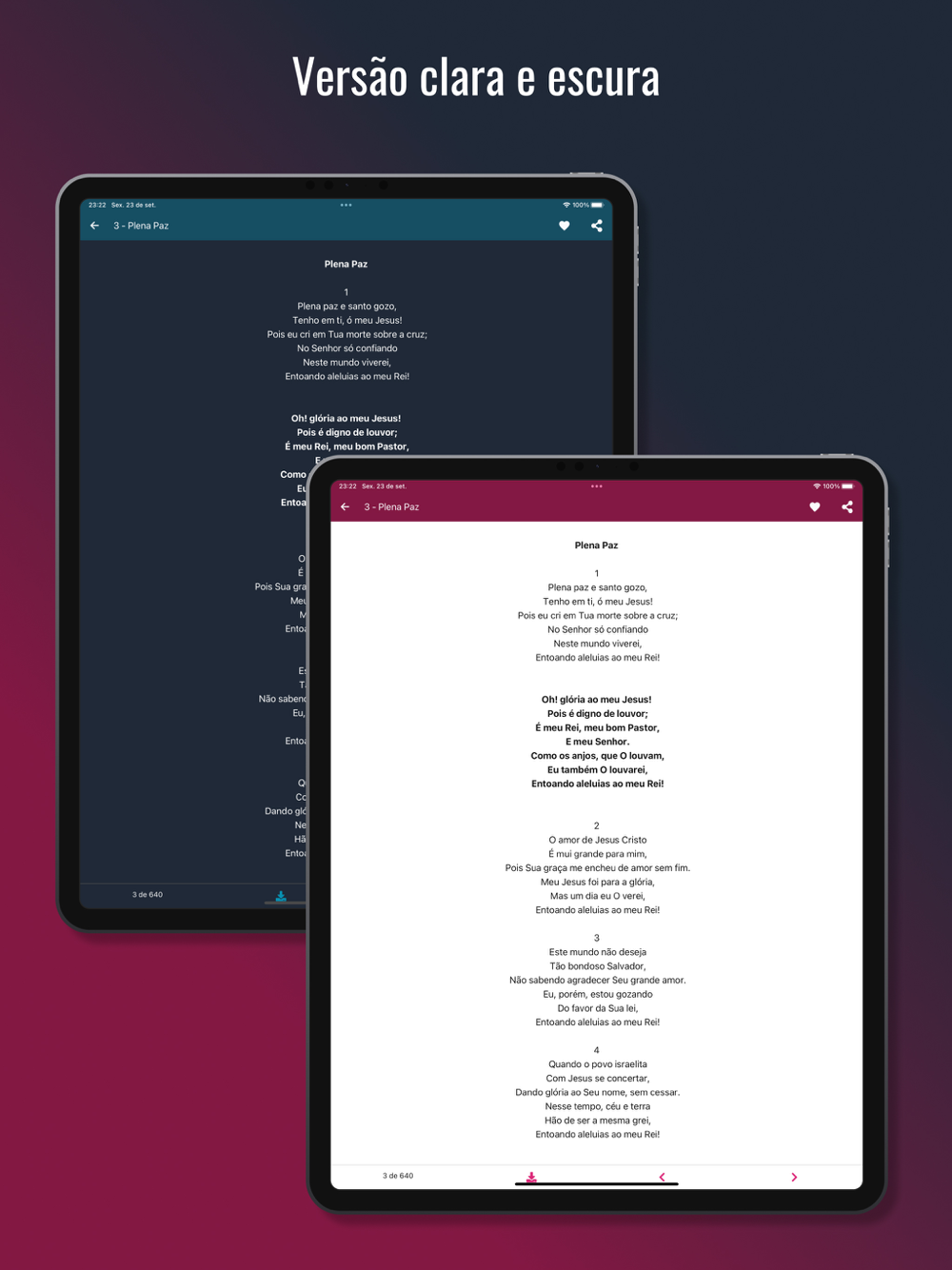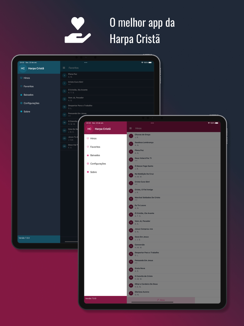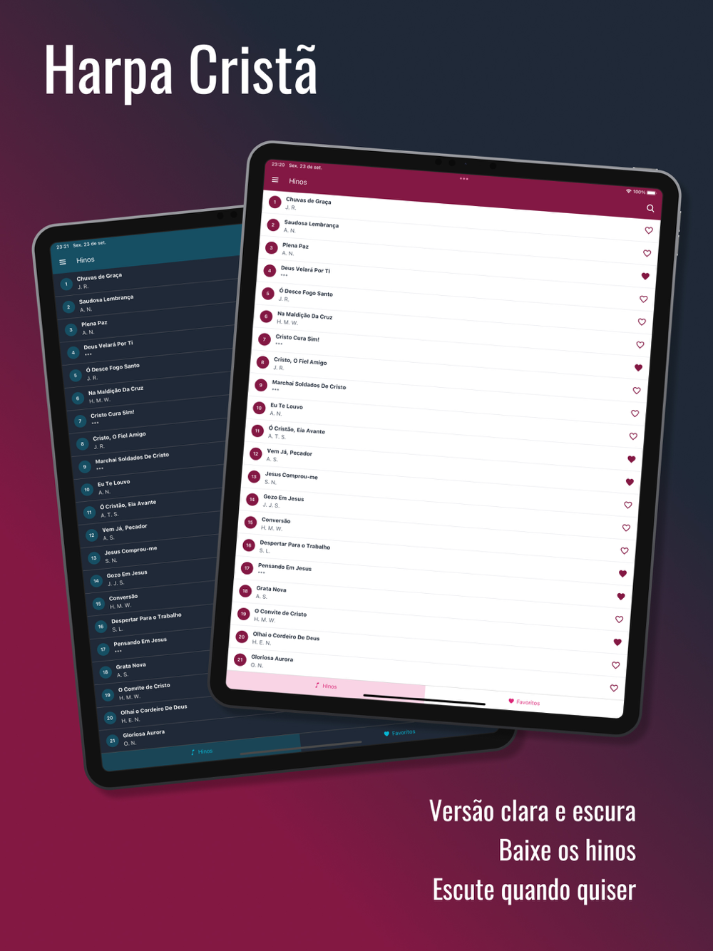 A Harpa Cristã é o hinário oficial das Assembleias de Deus no Brasil, foi lançada em 1922 com 640 hinos. Com o aplicativo da Harpa Cristã você tem disponíveis todos os Hinos da Harpa, além de escolher seus hinos favoritos, compartilhar as letras dos hinos e ouvir hinos de maneira offline, caso já tenha baixado pelo aplicativo.