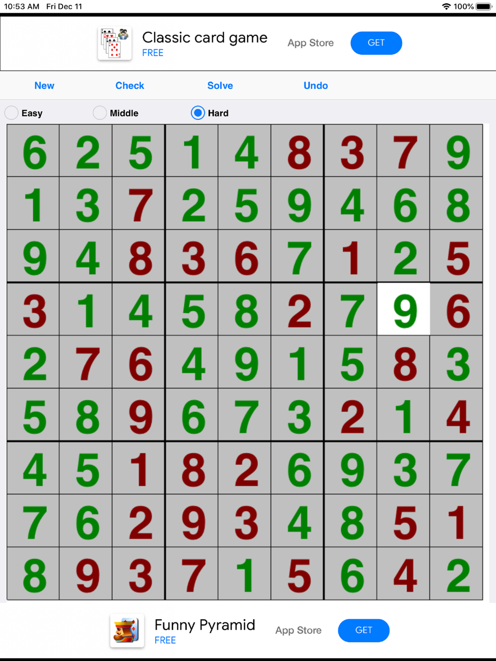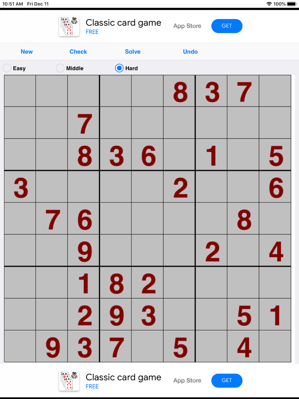Sudoku (数独, sūdoku, digit-single), originally called Number Place is a logic-based, combinatorial number-placement puzzle. In classic sudoku, the objective is to fill a 9×9 grid with digits so that each column, each row, and each of the nine 3×3 sub grids that compose the grid (also called "boxes", "blocks", or "regions") contain all of the digits from 1 to 9. The puzzle setter provides a partially completed grid, which for a well-posed puzzle has a single solution.