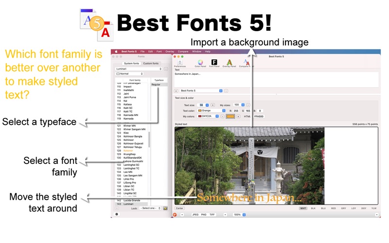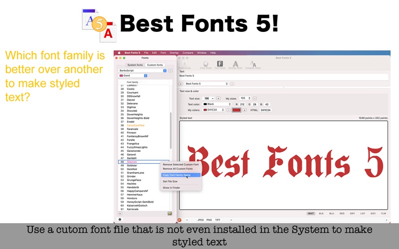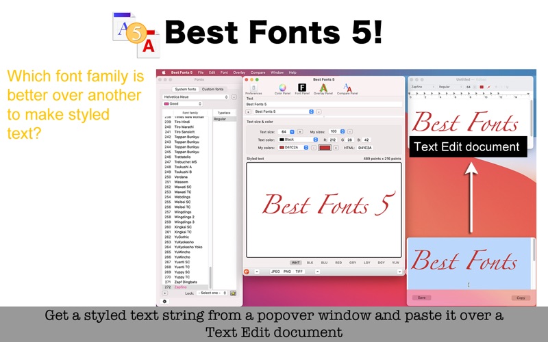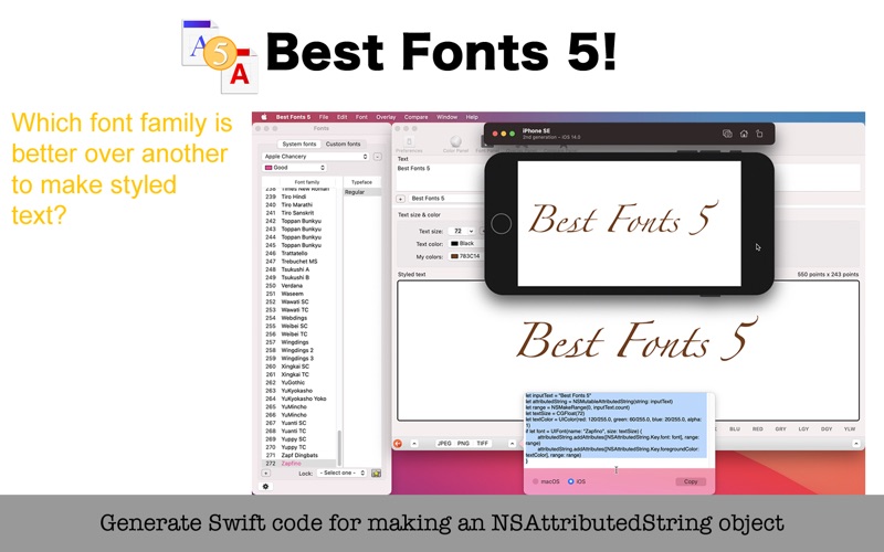 Formerly known as FontsView, Best Fonts 5 lets you decide which font family is better than another in making styled text. You can use installed font files as well as custom font files that aren’t even installed in the System to make styled text. If you develop apps, writing code in Swift, Best Fonts 5 even lets you generate Swift code so that you can create an NSAttributedString object.