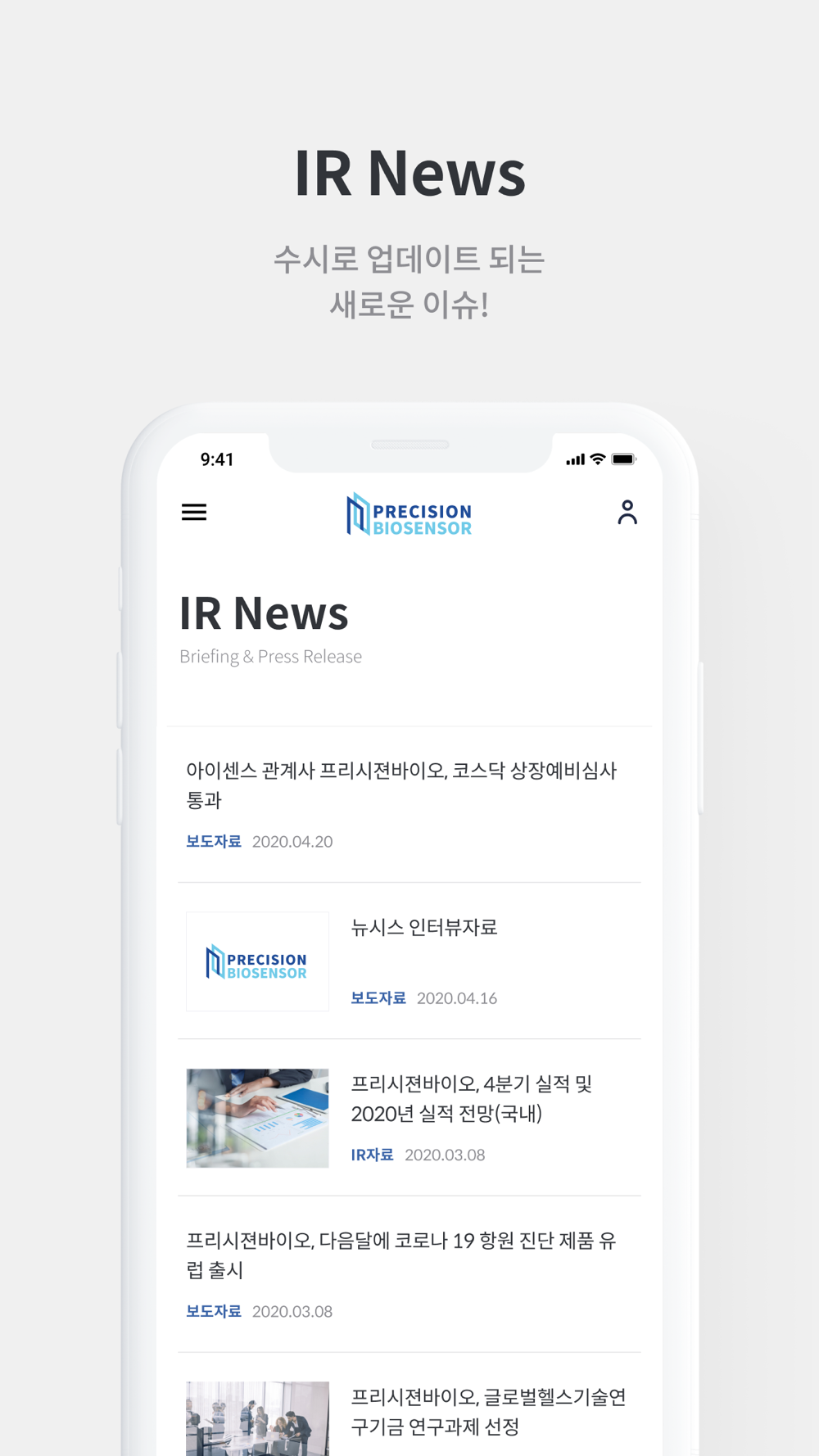 프리시젼바이오 “IR Page” Application은 실시간 주가, IR일정, 분기별 실적발표자료, 다양한 IR News, 주요 경영보고서, 재무정보, 공시, IR담당자 Contact 정보 등 최신 IR정보를 제공합니다.