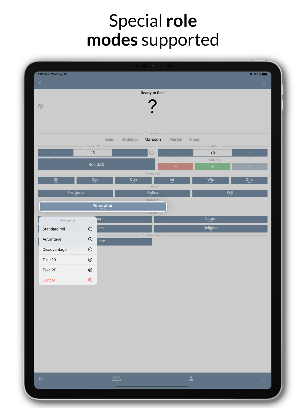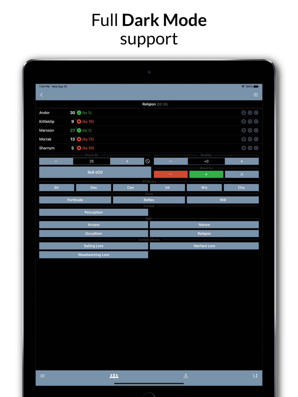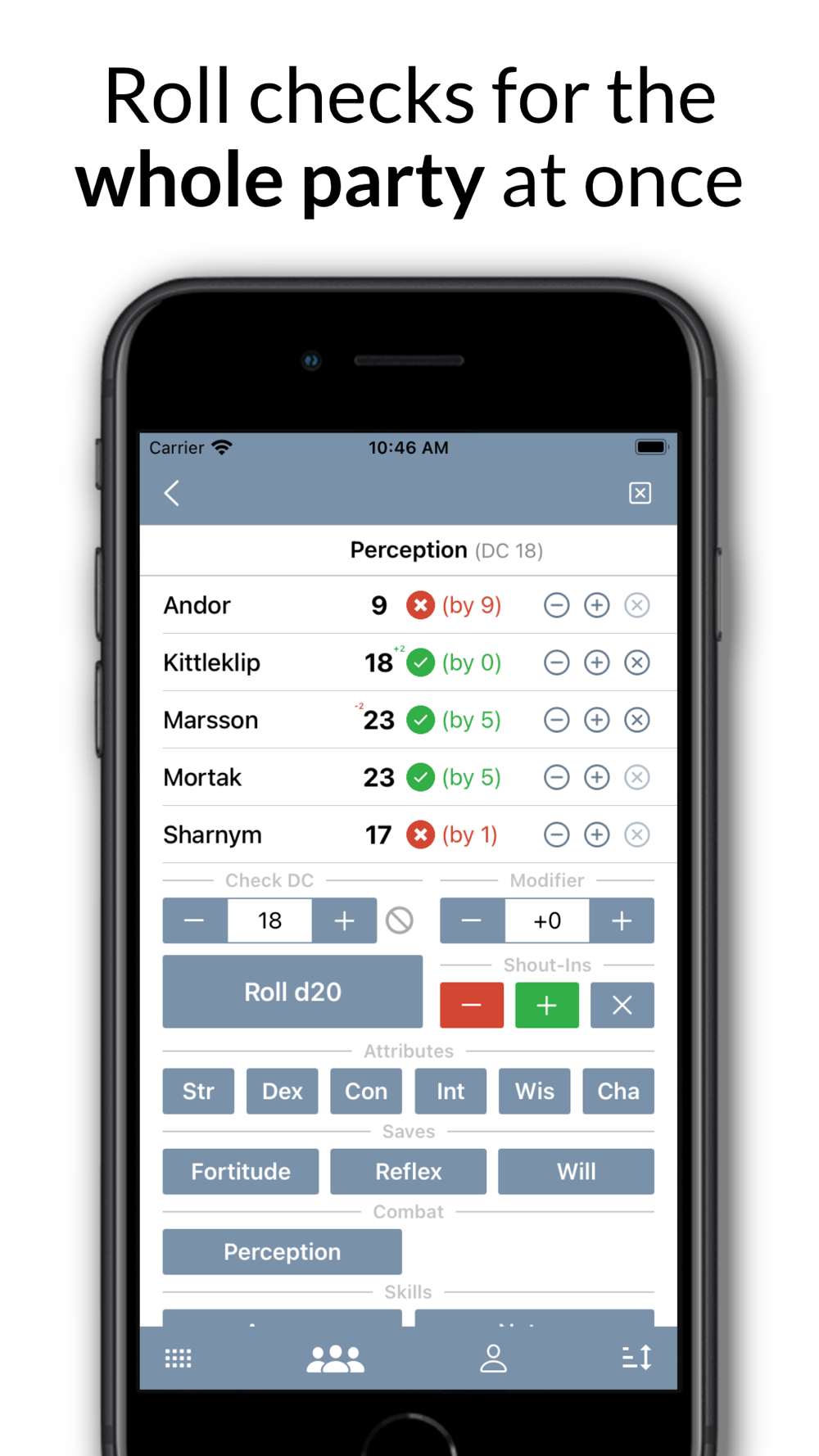 - Quick access to attribute checks, saves and skill checks for the entire party.