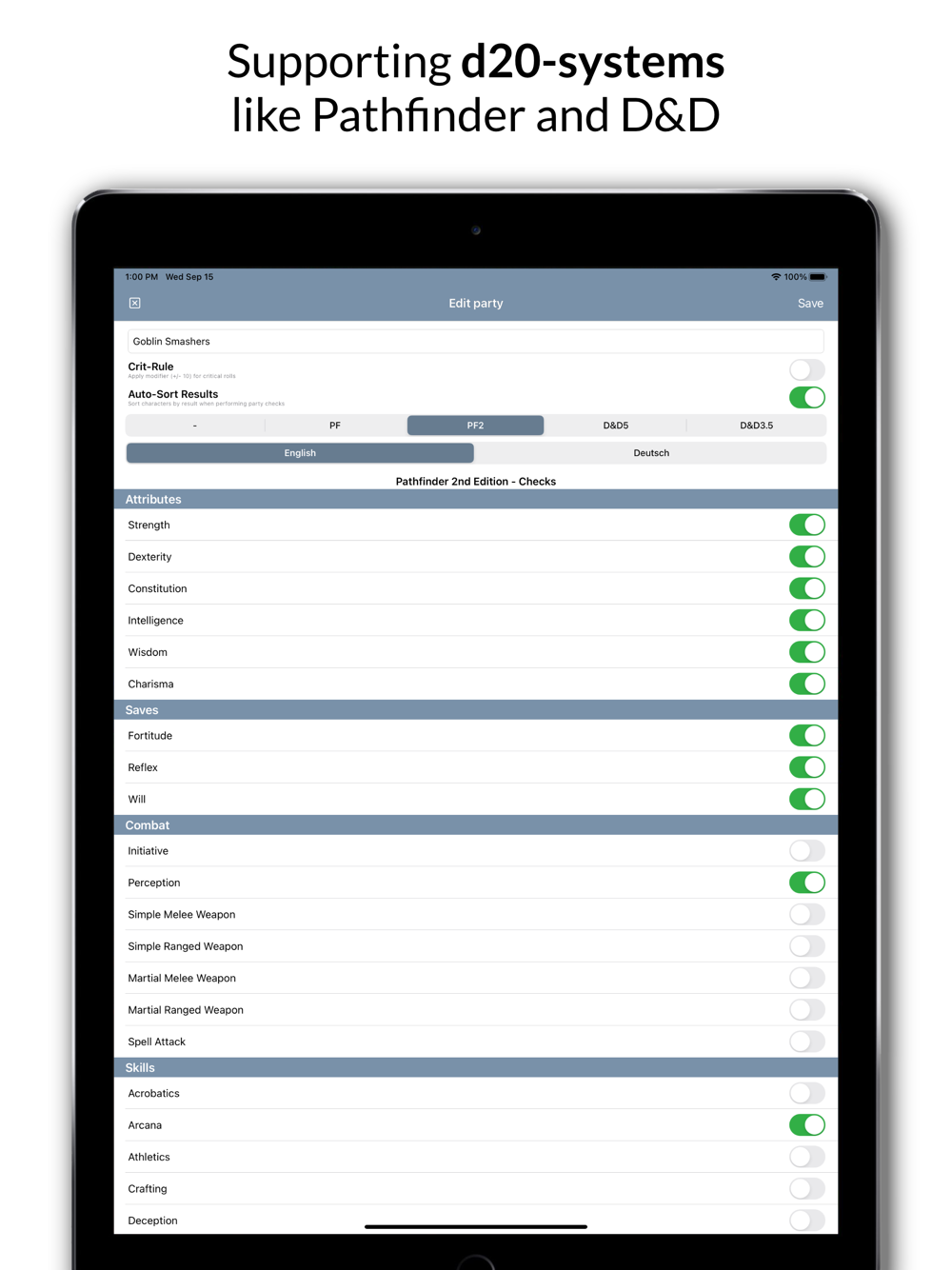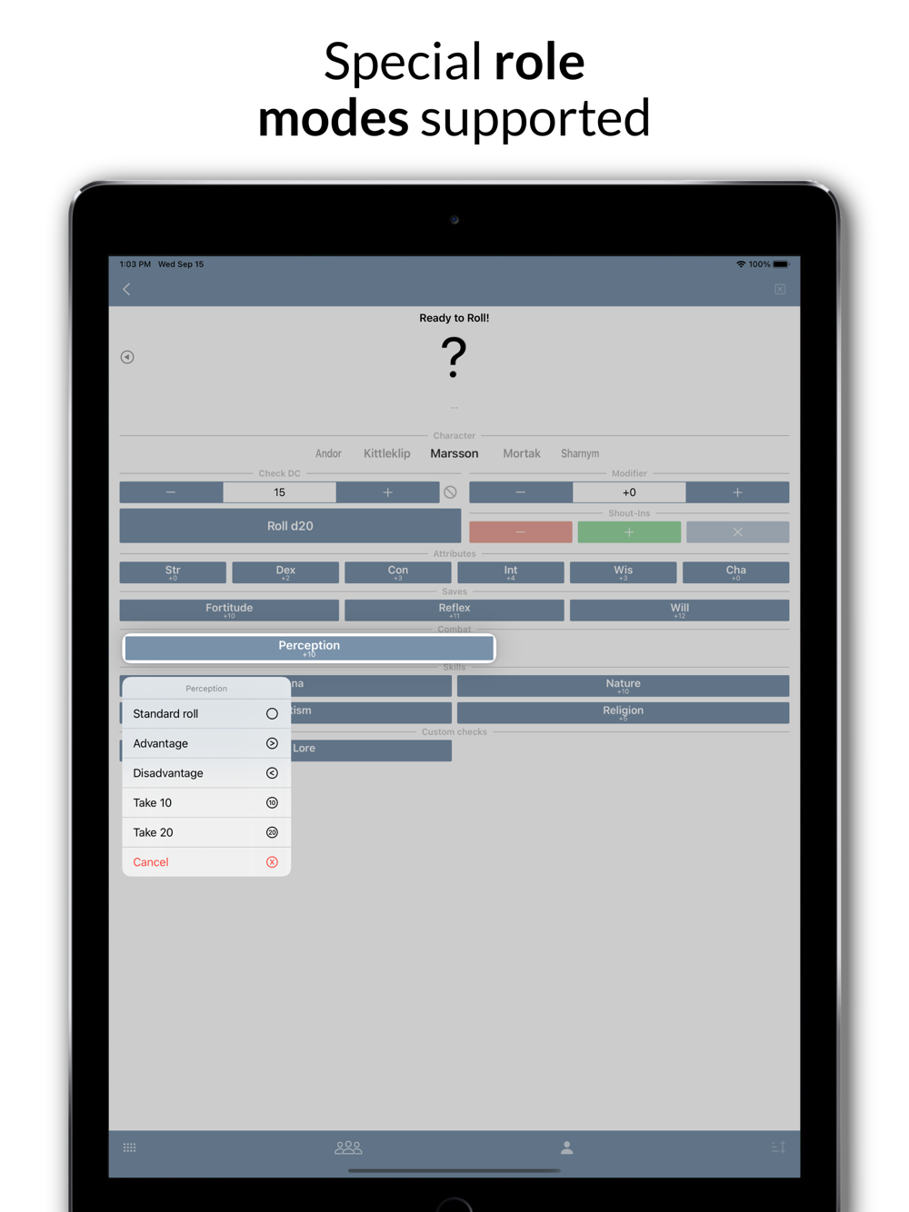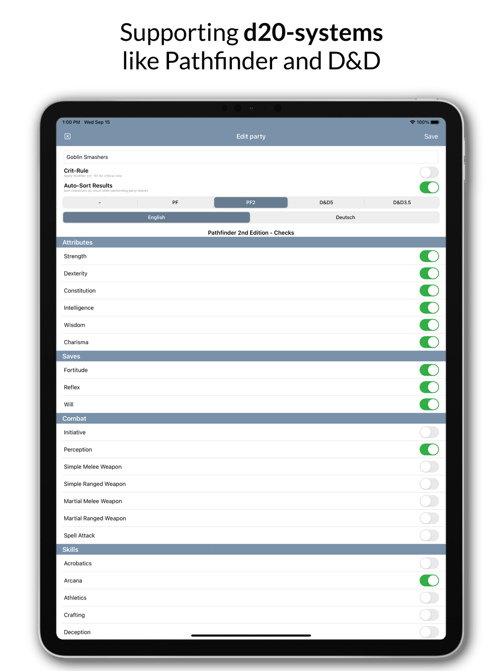 - Quick access to attribute checks, saves and skill checks for the entire party.