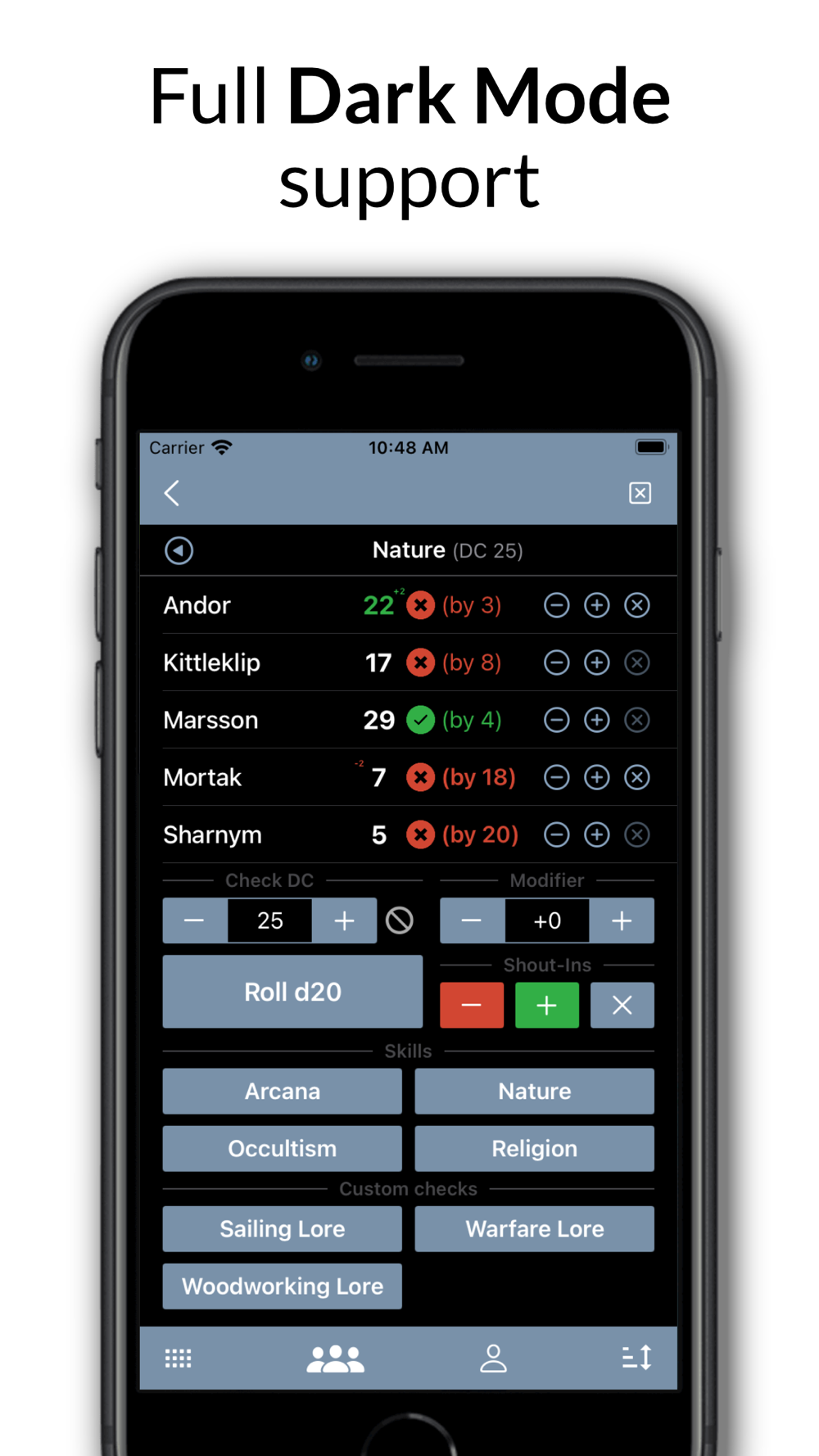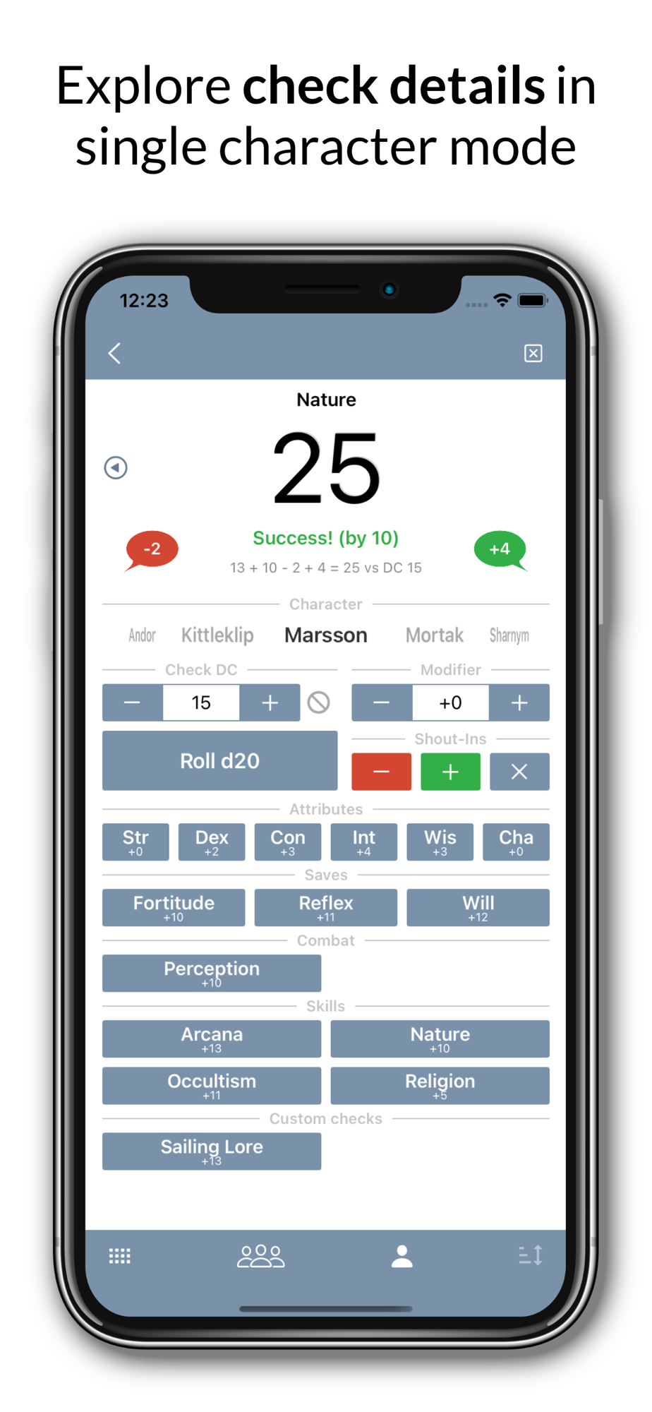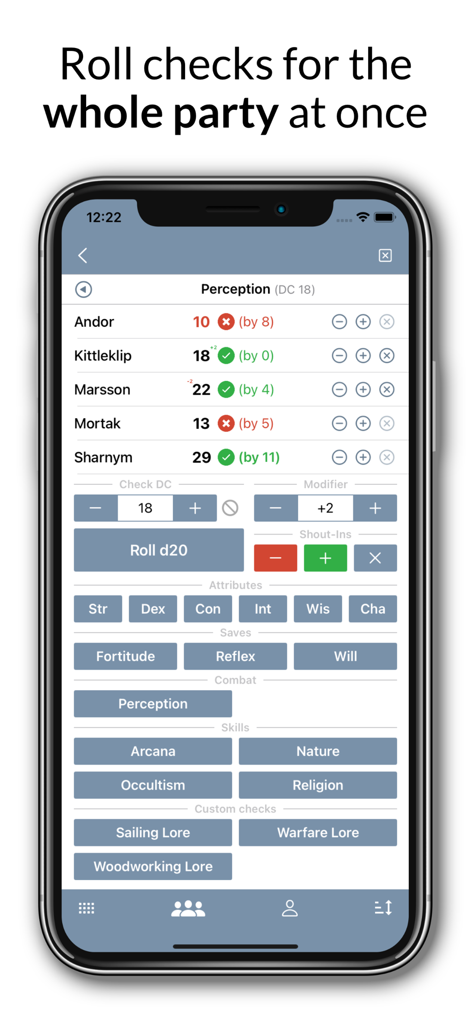d20 Party Checks is an app for game masters (GMs) of fantasy roleplaying games based on the d20 system, such as Pathfinder or Dungeons & Dragons. Its purpose is to allow the GM to make a secret roll for all player characters within a few seconds. Depending on the play style of the GM, perception checks, knowledge checks, appraise checks, can be made secretly, so as not to burden the players with unnecessary meta-knowledge or even spoiling the game. However, too often in these situations the narrative flow suffers - possibly also the immersion - or already the question "How high is your character's perception modifier?" gives too much away. Most game masters have a piece of paper in front of them on which they have written down all the important skill checks, attribute checks, and saving throws of the player characters and can quickly make the check. However, if it comes to a check for the entire party, quick rolls and comparisons are required for each player character of the group. This is where d20 Party Checks comes in: One click and the result is there - for the whole group!