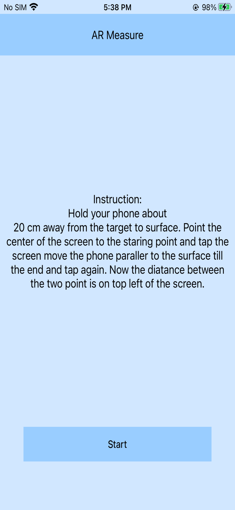 This app use the AR technology to measure the distance. Simply keep the phone at a distant of about 20 cm from the target keeping the center on starting point and tap on the screen to mark starting point and move to the other end and tap again to stop measuring. The measured distance is on the top right of the screen.