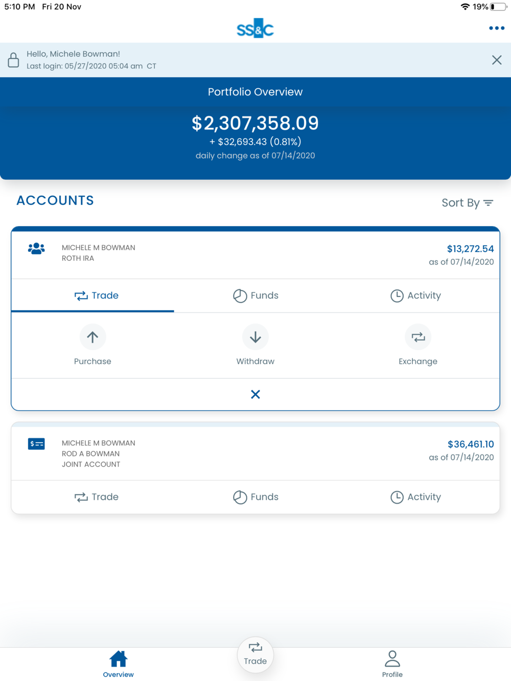 The SS&C Holdings mobile app allows users to manage their mutual fund investments. Transact, review, and plan for the future by managing your funds wherever you are.