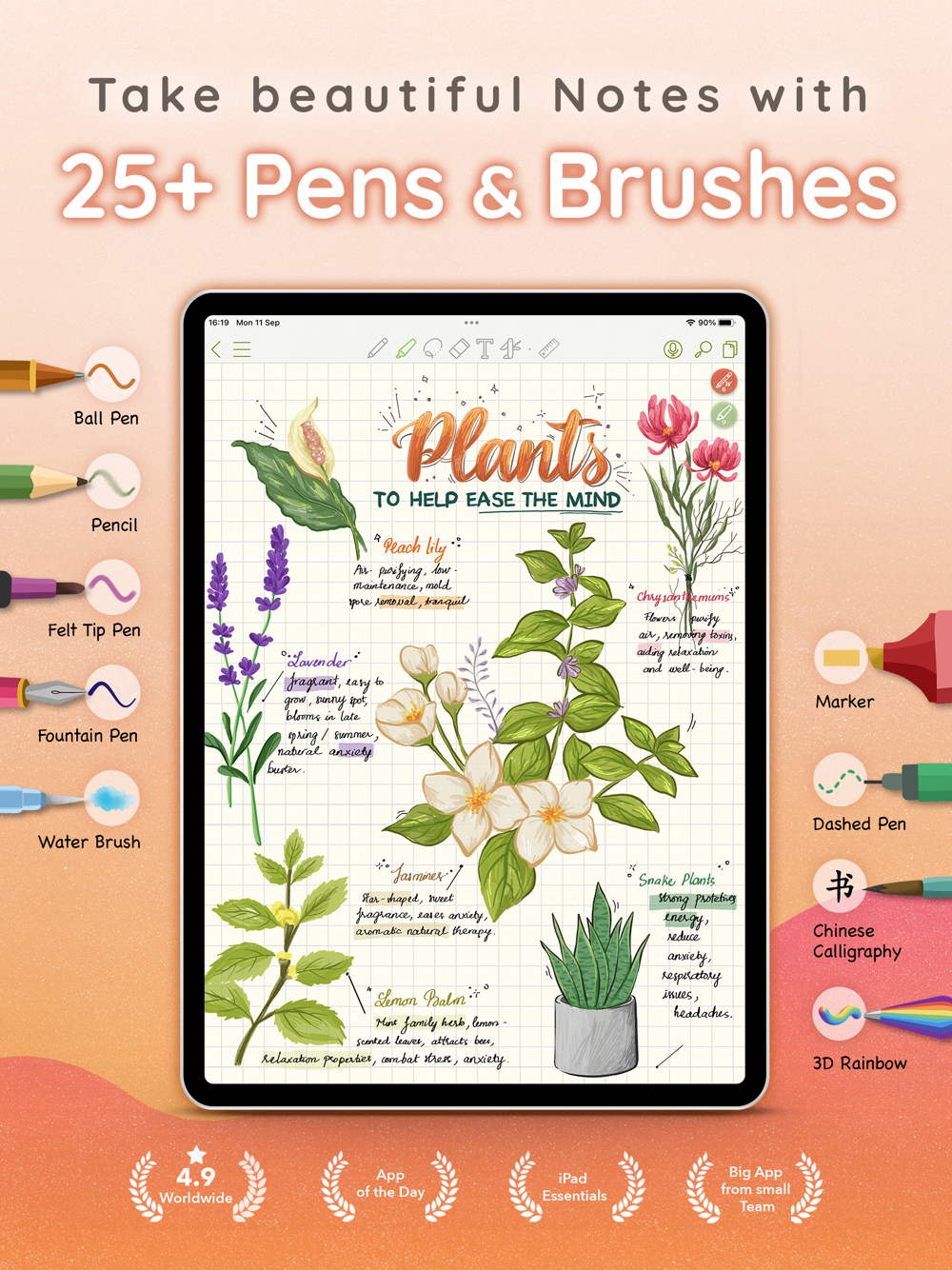 - Versatile Toolset: Experience an extensive collection of 25 pens and brushes, surpassing other note-taking apps in options for creativity