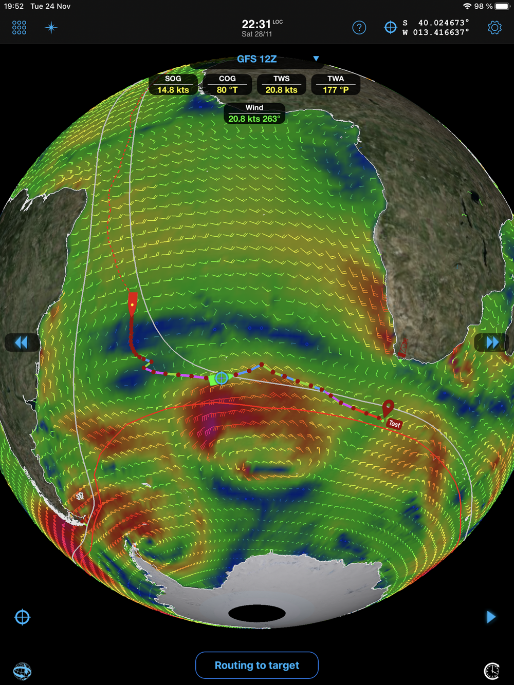 The routing algorithm considers the specifics of the game to minimize penalties subject to sail changes, tacking and gybe. It also takes into account the exclusion zones (ice limit) imposed by the game as for real regattas.