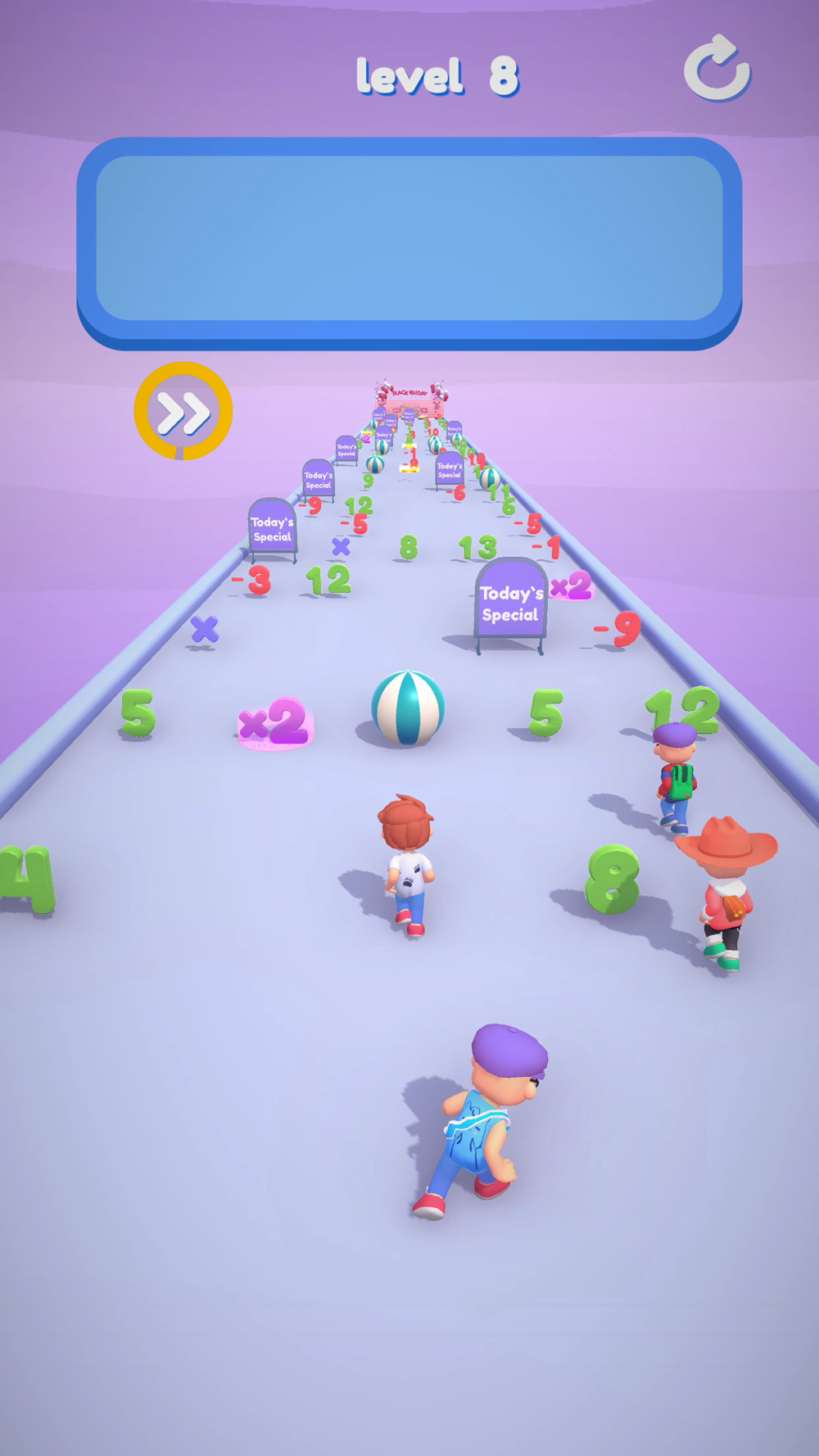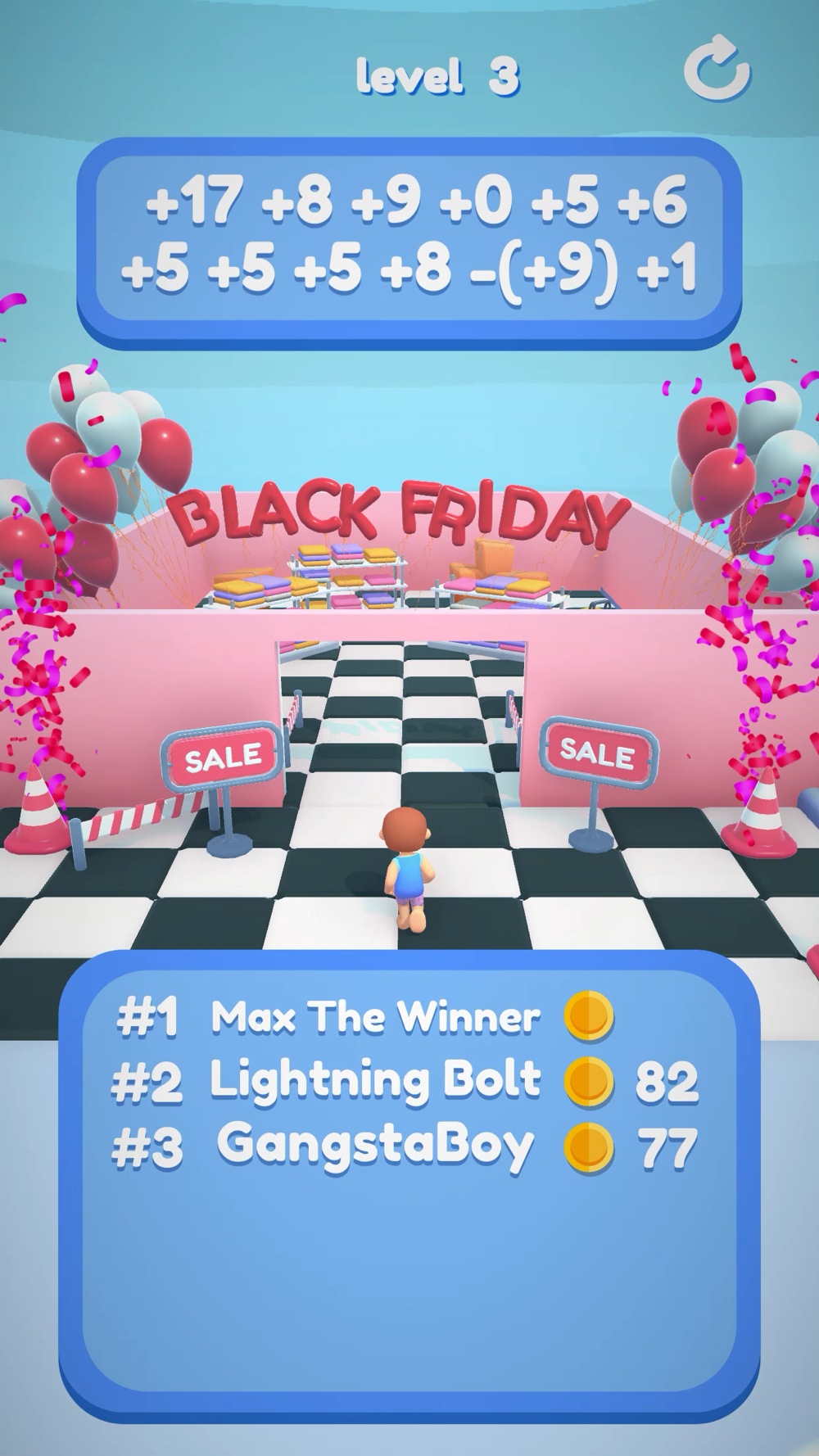 Get ready for the Black Friday sale! Run towards discounts, leaving opponents behind. Collect numbers, plus signs and double multiplication. Try to get around obstacles and negative numbers. The sum of all the numbers that you collect will be your purchase amount!