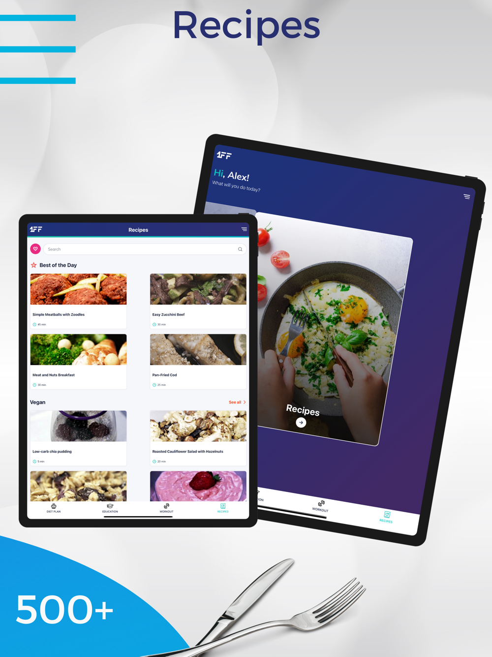 1FF Recipes module is dedicated for those users who get bored of their daily eating routine and want to diversify with another healthy meal. In it, you will be able to find exciting meals from all over the world with the option to filter and rate each recipe.