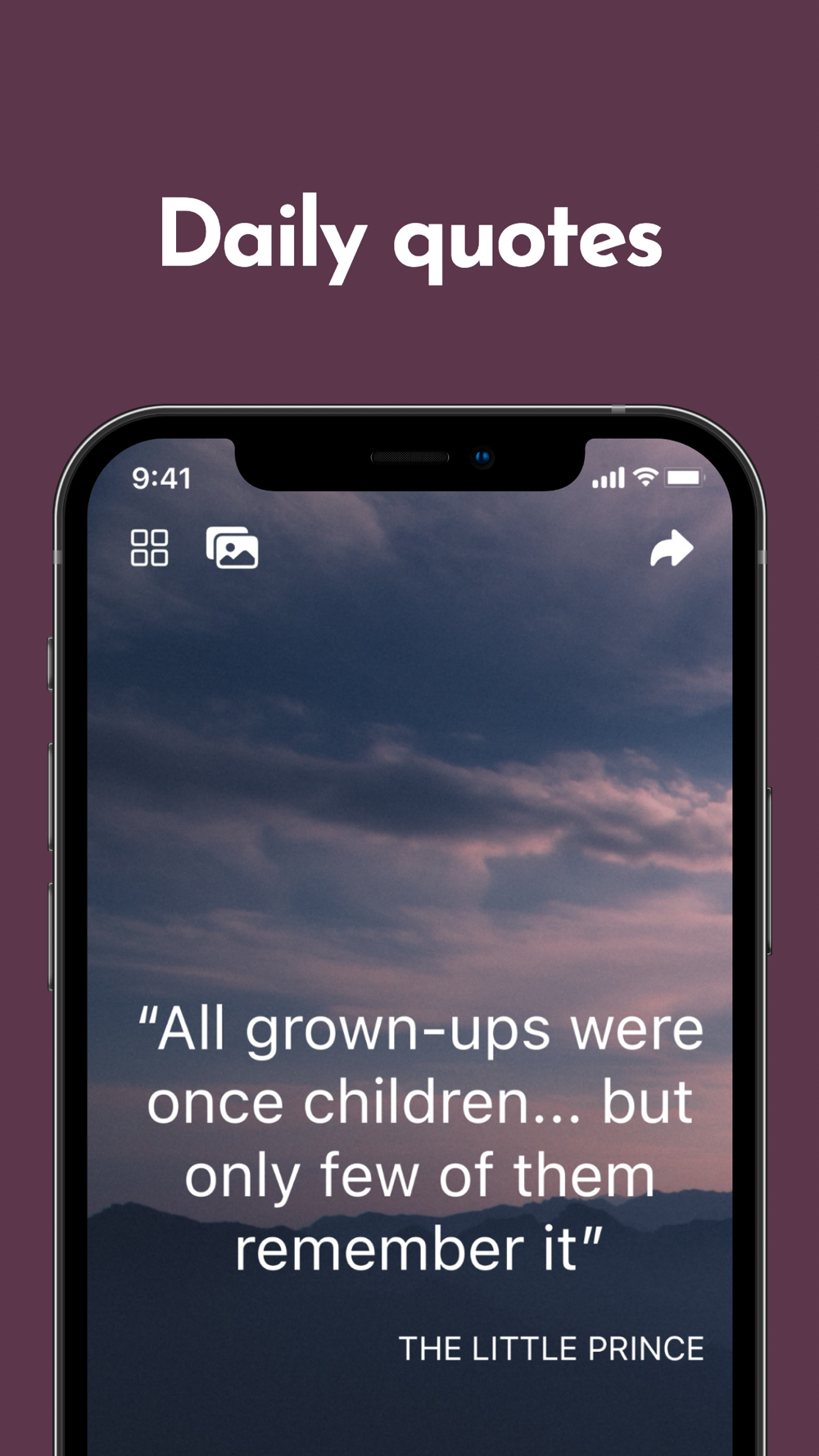 Our App includes a wide range of categories, where you can choose the ones you like. Customize a design and set the backgrounds that suit your mood, set daily reminders, get your daily quote, and share it with your friends!