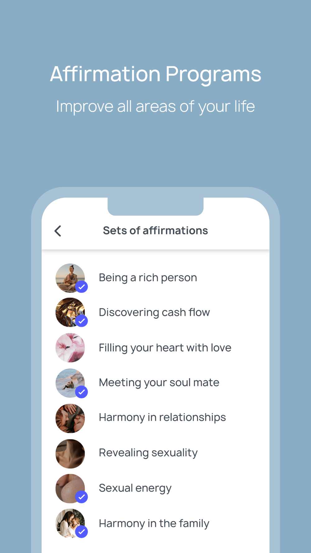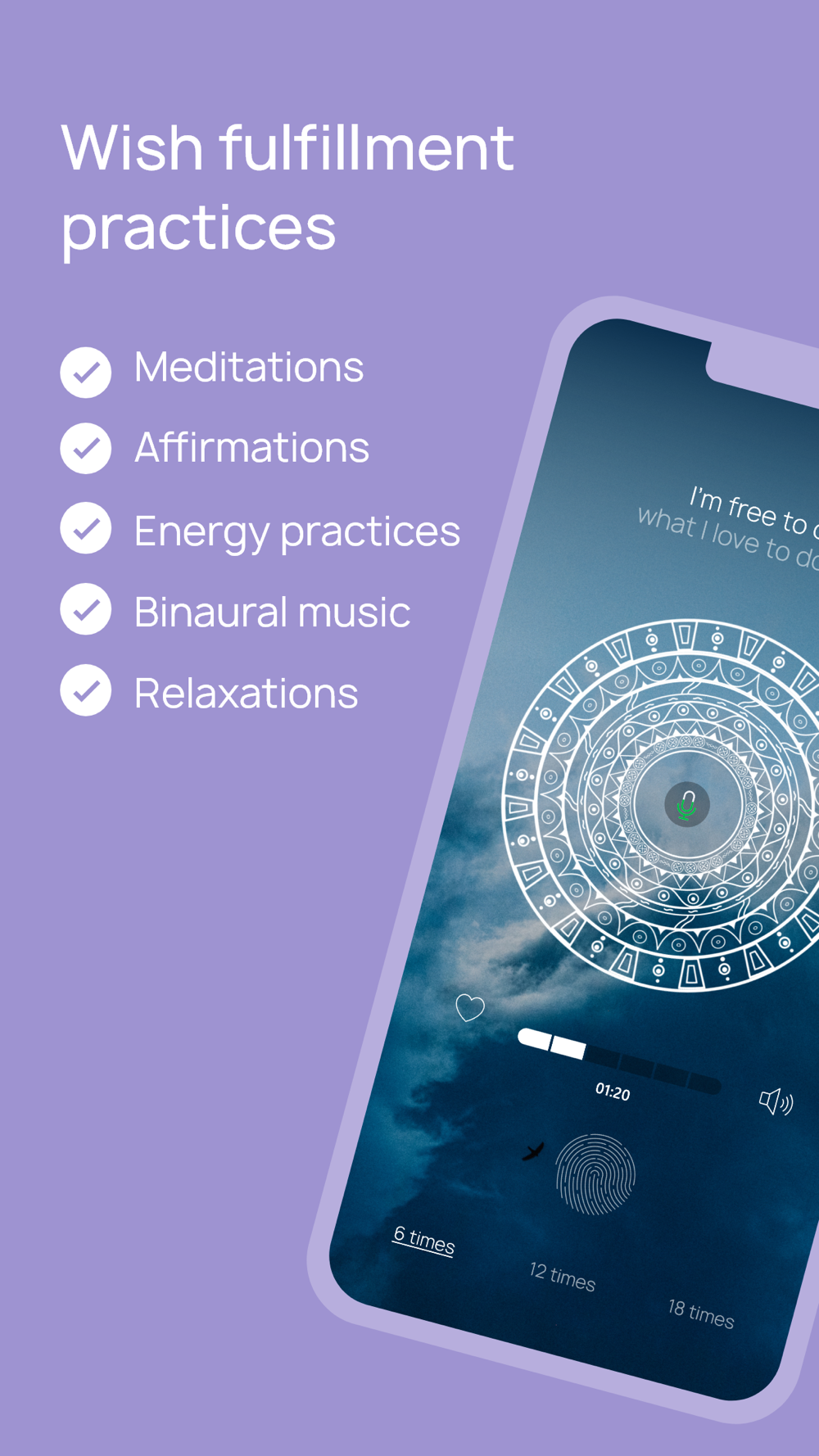 Our application has two types of practices: meditations and affirmations. Meditations improve mood and relieve stress, while affirmations form a new way of thinking, help you gain confidence and achieve happiness in life.