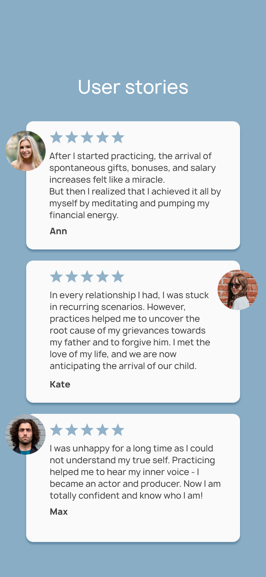 At the first launch, the Mentor will ask for your name, birthdate, and gender. All these are important factors in shaping a person's destiny. Then, we will use the stars to determine your character, strengths, and energy level and offer a personalized selection of affirmations.
