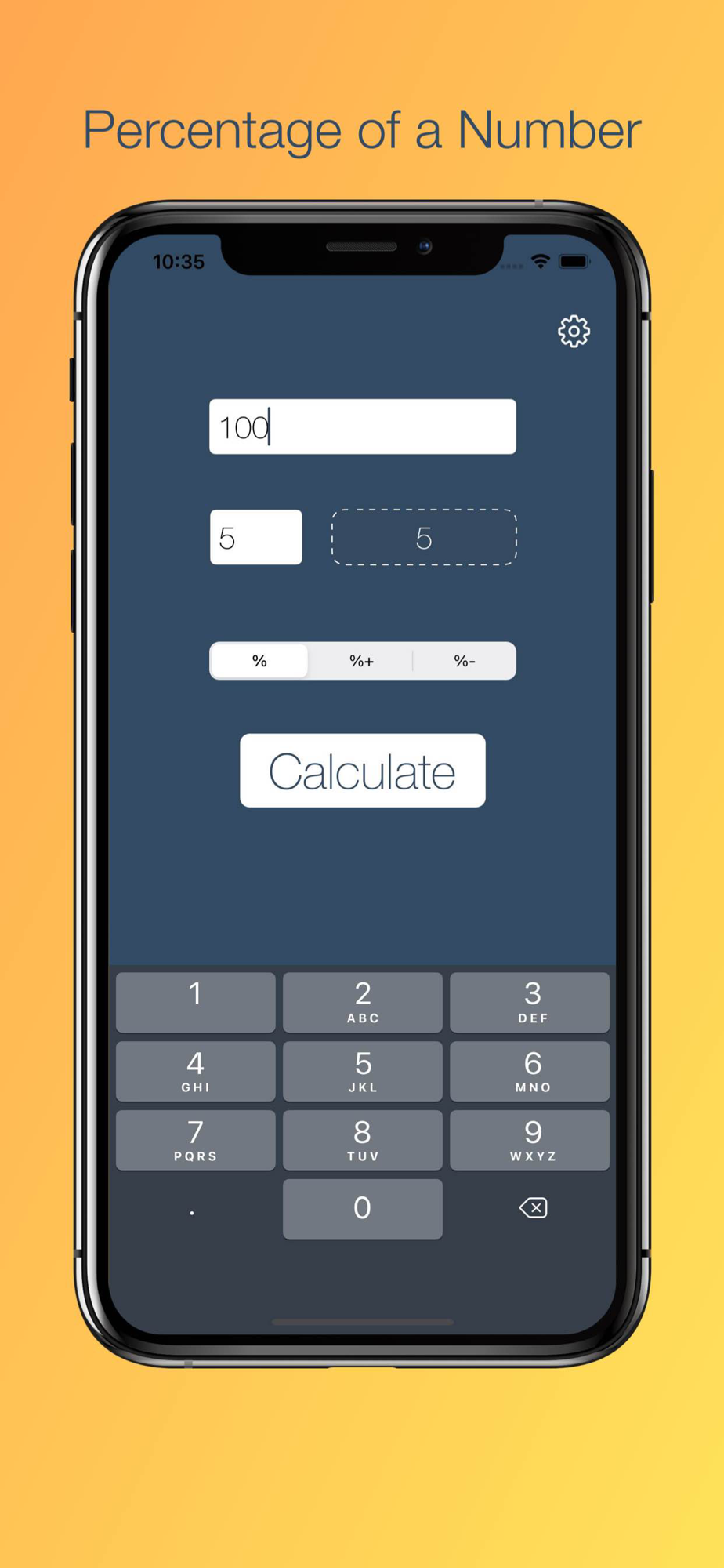 • Quick and easy switching between three different calculation types (1. Percentage of a number, 2. Increase a number by a percentage, 3. Decrease a number by a percentage)