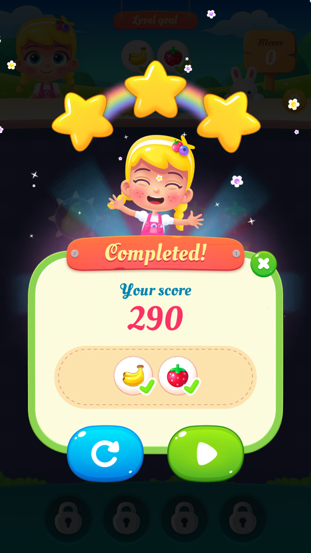 Match 3 and four, five, or more fruit Use their special abilities to munch more fun.