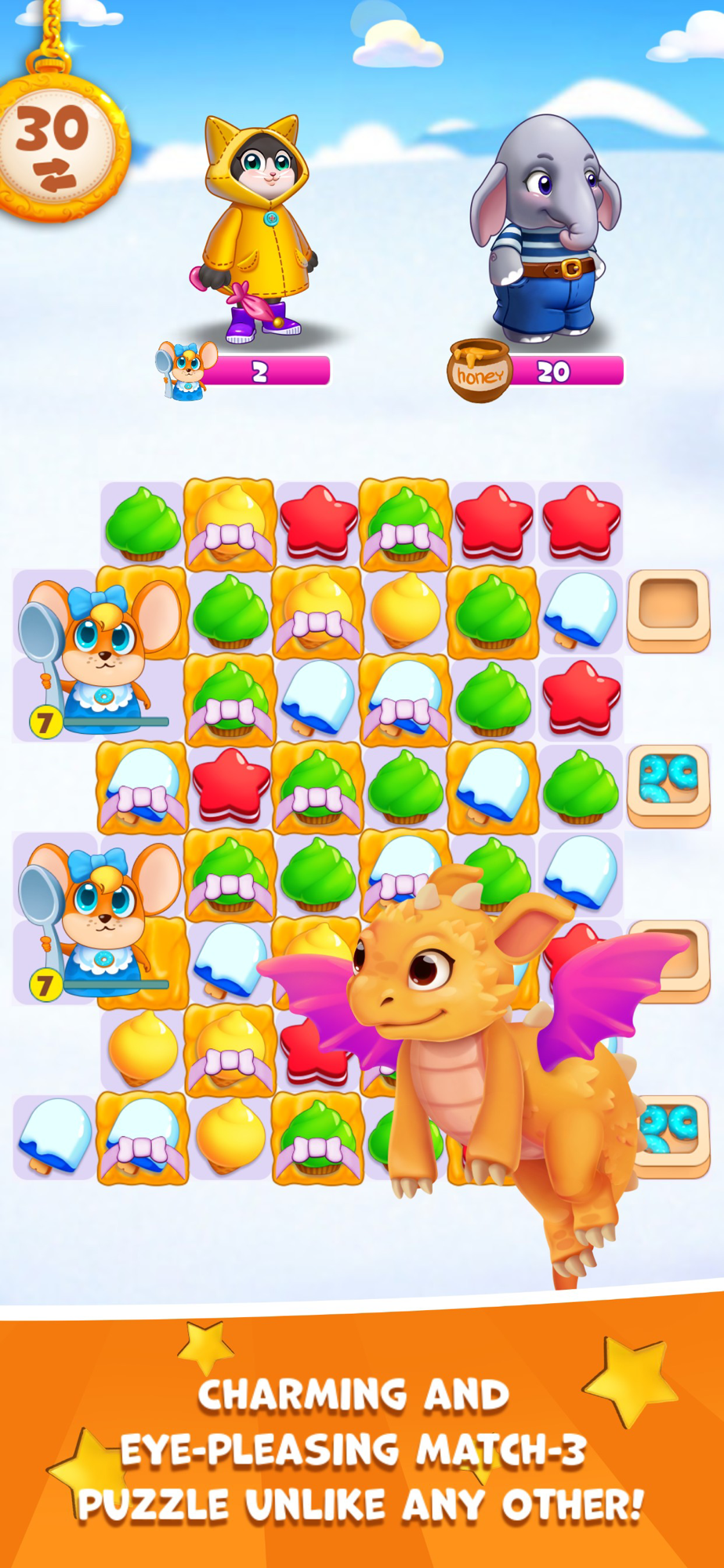 Fill the bellies of cute friendly locals with your every swipe! Match amazing combinations to invite sweet charmers to the gaming field and make the process of collecting even more enjoyable! Get the stars from the infinite blue sky and exchange them for useful gifts! Share your love for the game with friends and find out who can provide more sweets to Chamlandians!