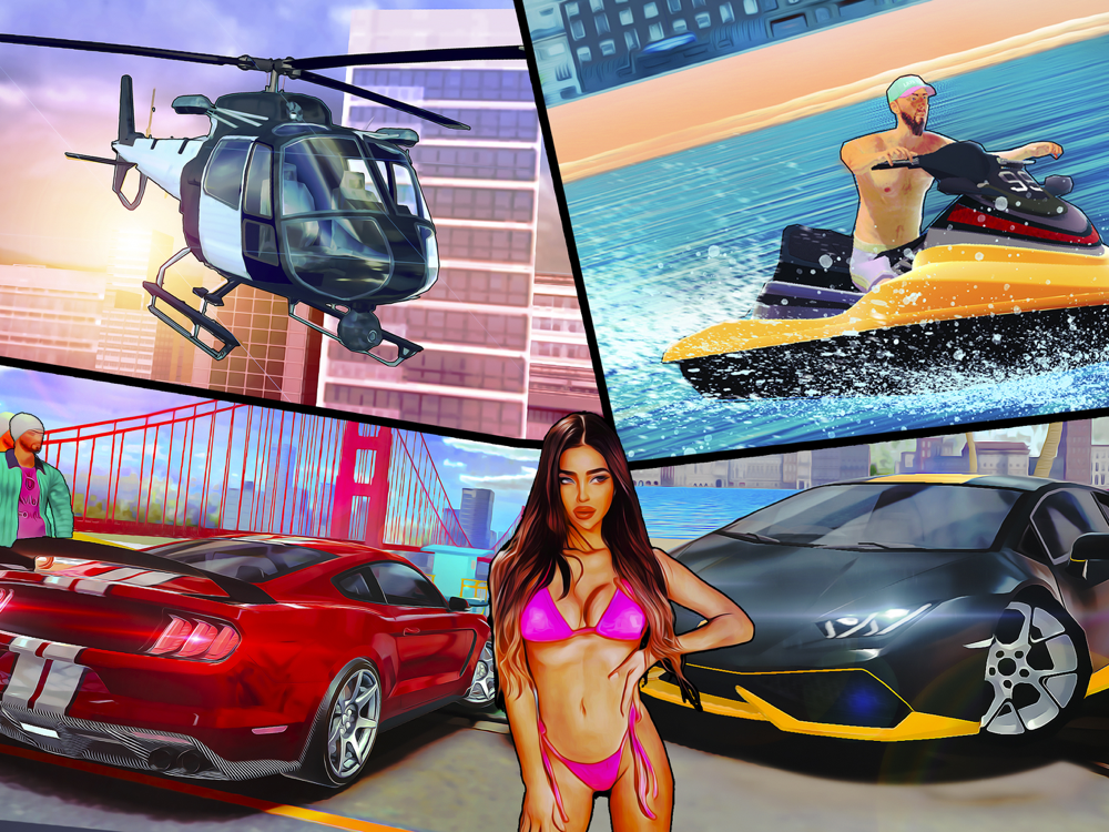 Your accuracy while driving in this vegas metropolis will be a real test, because strict police control will not give you peace. Explore the urban crime city streets, and if necessary, go to the airport to take off on a huge grand theft plane. The urban crime city's wide roads allow cars to reach breathtaking speeds and you can even use the surrounding gtav structures for your pleasure. Choose your mafia boss character's style to highlight your personality, use a gun and have a real steal car with fun!