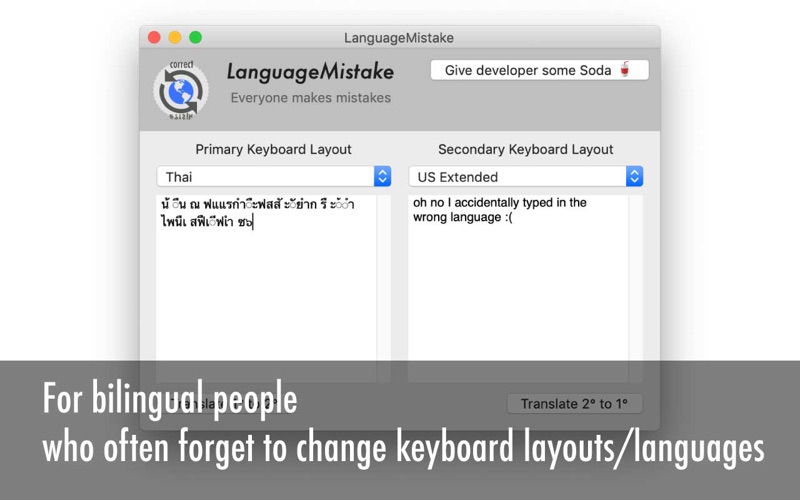 Sometimes almost a whole line seemingly wasted. This app helps you convert any selected text from your primary (1°) to your secondary (2°) language, and vice versa.