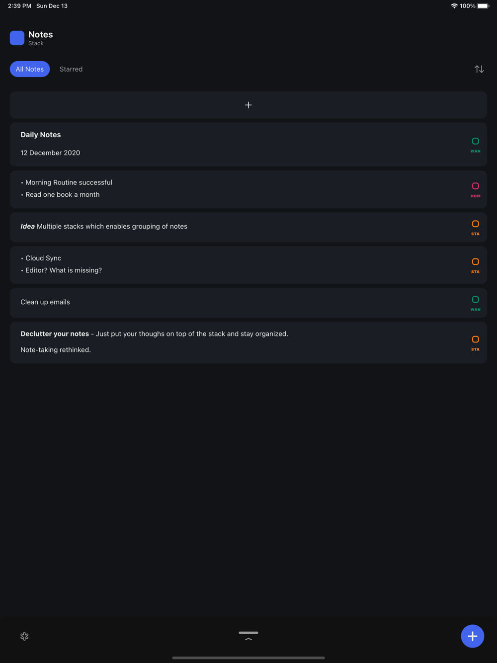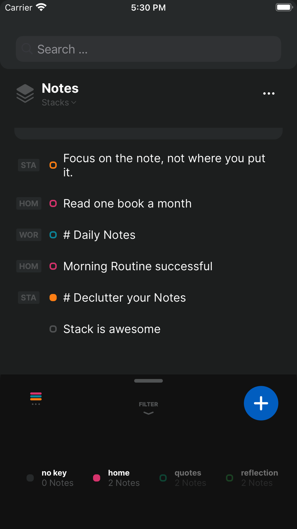 Stack is another way for notes. Instead of constantly forcing yourself to find the right subfolder for your new notes to keep order, with Stack you just write a new note and give it a key - the app does the rest.