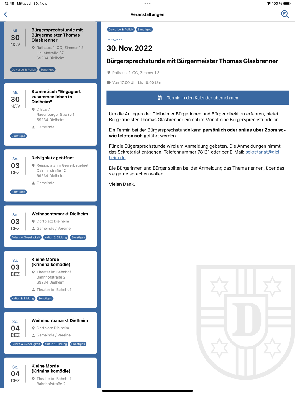 Mit dieser App erhalten Sie einen schnellen und einfachen Zugriff auf aktuelle Meldungen der Gemeinde Dielheim. Darüber hinaus können Sie sich über Veranstaltungen und andere Termine informieren und diese direkt in Ihren eigenen Kalender übernehmen. Informationen aus dem Rathaus erhalten Sie mittels Push-Nachrichten, deren Empfang Sie über die Auswahl einzelner Kategorien selbst steuern können. Bleiben Sie stets up to date – mit Ihrer Dielheim-App.