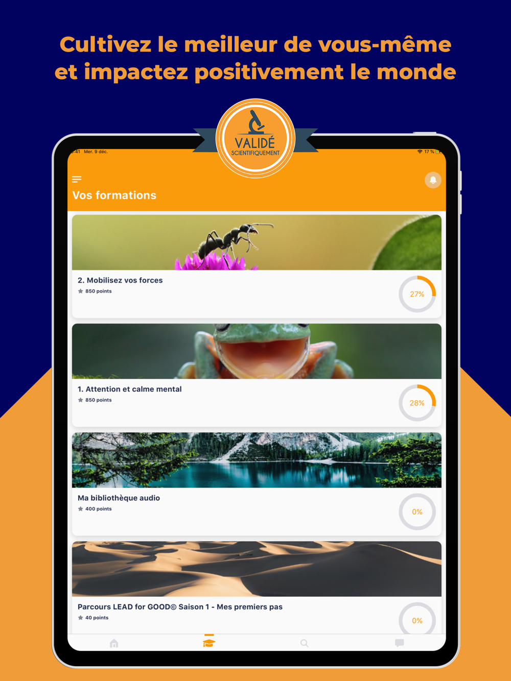 Après 7 ans de recherches scientifiques avec les plus grands chercheurs et déjà plusieurs milliers de personnes formées dans le monde, notre Institut est heureux de vous proposer la saison 1 de Lead for Good ®. Un parcours de formation personnelle unique, ludique et simple pour développer vos compétences humaines et relationnelles. L’application vous accompagne progressivement dans l'acquisition de nouvelles compétences utiles pour vous épanouir au travail, gagner en performance et révéler le meilleur de vous-même.