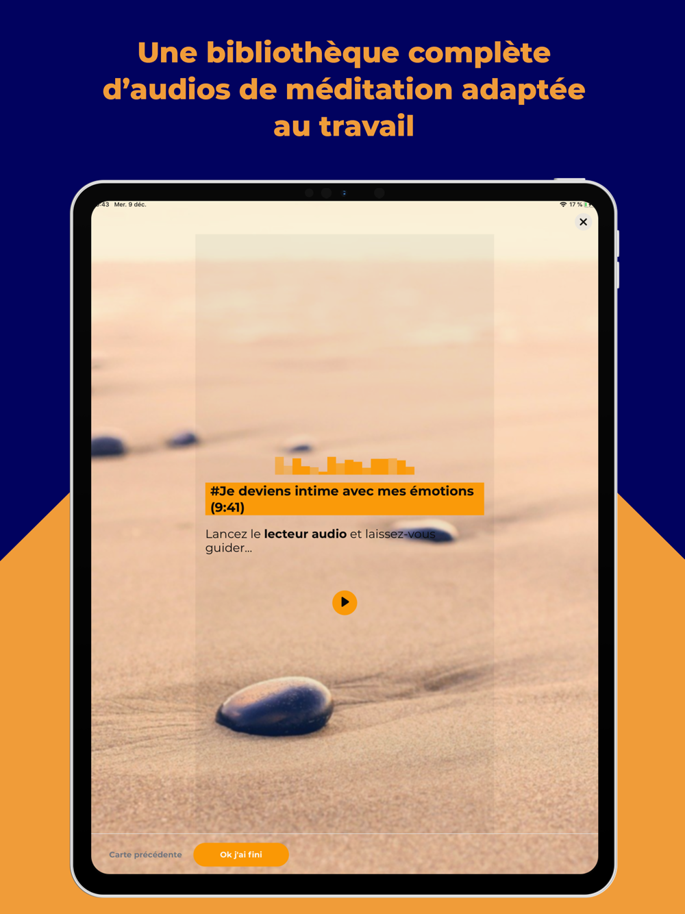> Une bibliothèque de dizaines de fichiers audio de méditation guidée, accessibles à tous pour débuter la méditation n’importe où, n’importe quand ou approfondir votre pratique selon vos besoins : réduire le stress, gagner en confiance, en bien-être, ressentir plus d’émotions agréables, retrouver le calme intérieur...De 3 minutes à 15 minutes, choisissez la durée de méditation qui vous convient le mieux.