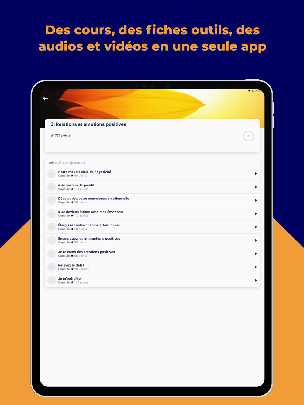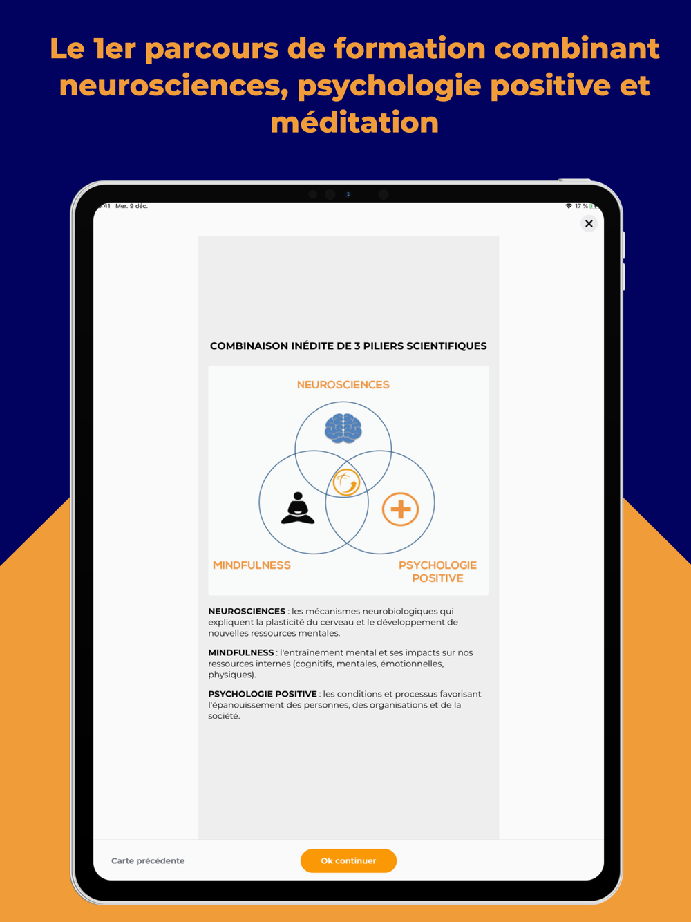 > 8 cours complets de la saison 1 offrant le meilleur de la psychologie positive, de la méditation de pleine conscience et des neurosciences accessible à tous en une seule App!