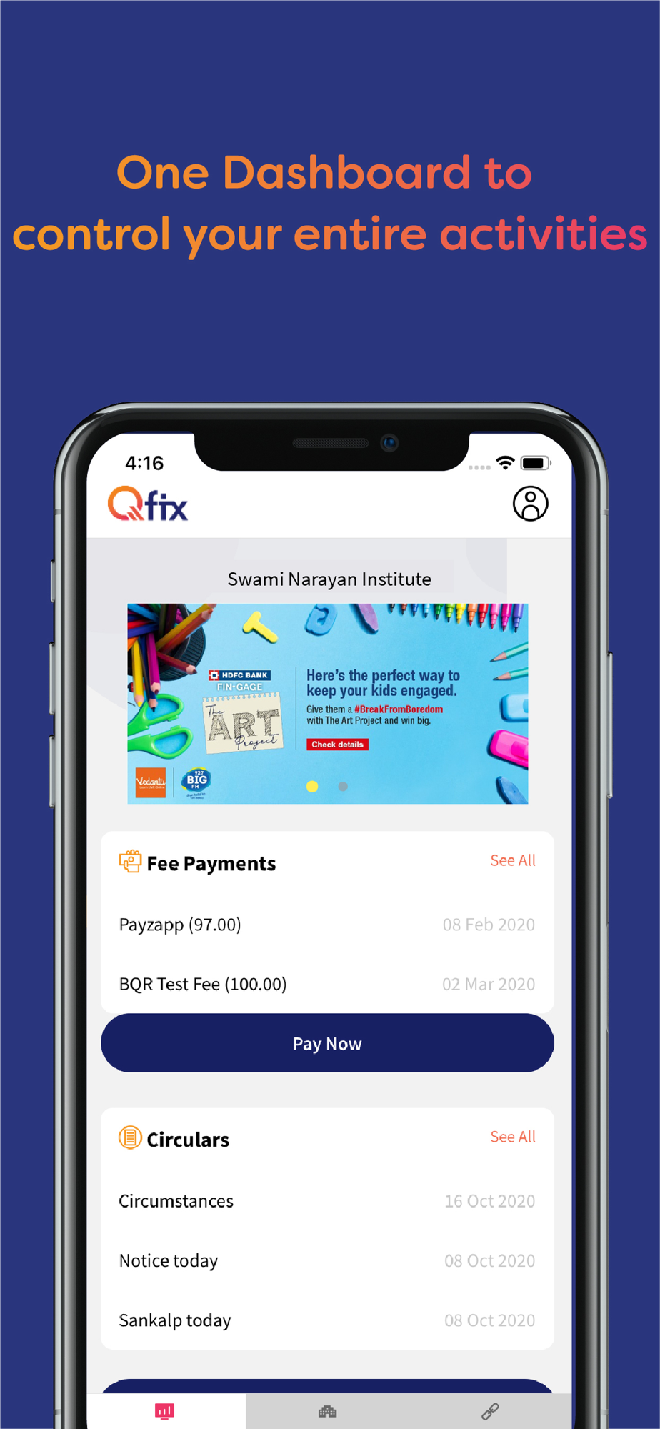 EduQfix application aimed at keeping a watch on the performance and conduct of a student in his school/college. The application is specifically designed to enable comprehensive e-communication /Mobile based communication between teachers, parents, and students, the status of the student’s academic maneuvering, functioning, and allied academic affairs, within the same school campus.