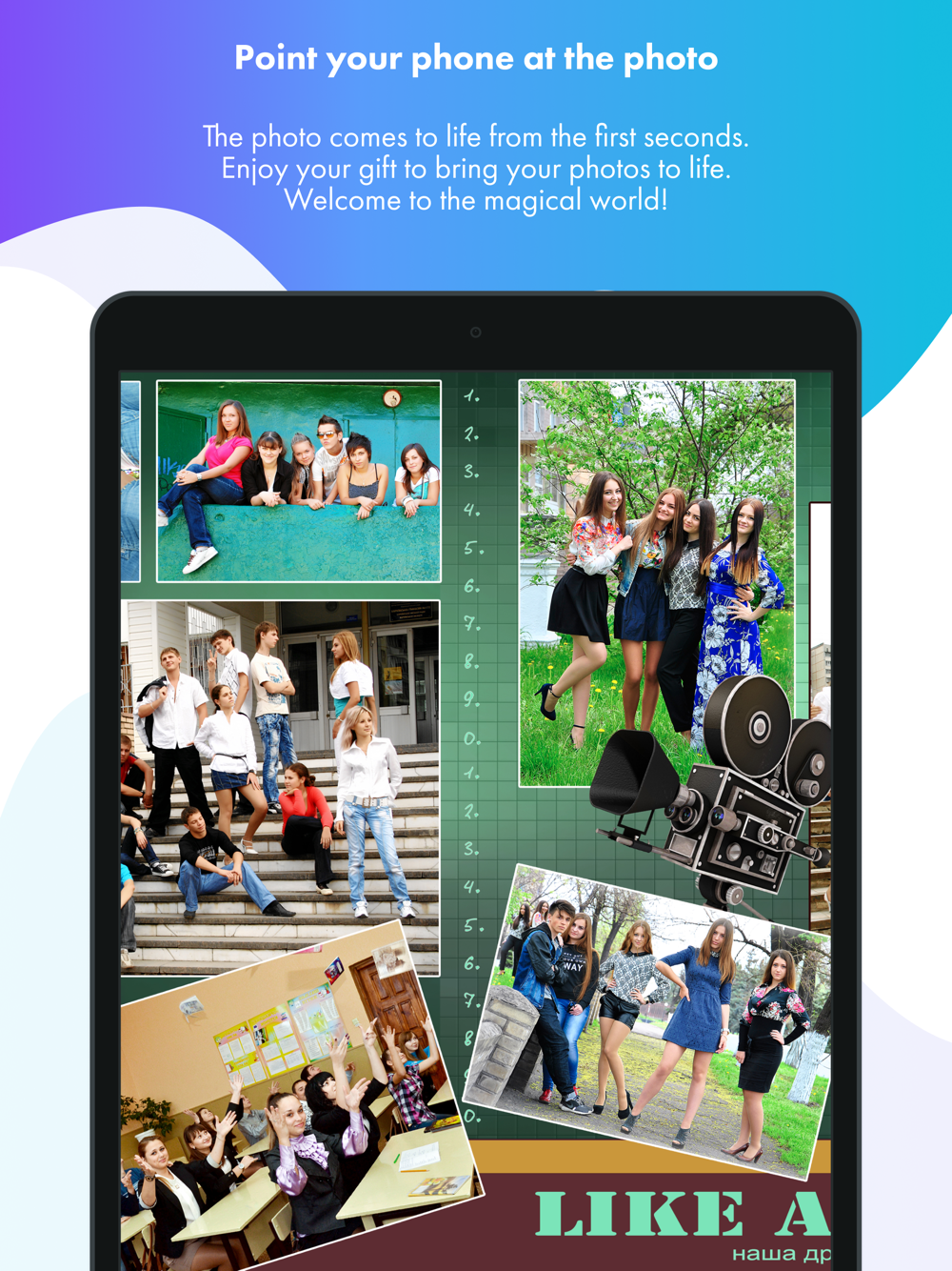 Live photos will not let your memories get lost. Just point your smartphone at the photo and go back in time to experience amazing emotions once again. With Magical Picture, it's easy to hear the babbling of a baby and the laughter of fellow students again, to see a family vacation at the sea or a round dance with friends around the Christmas tree.