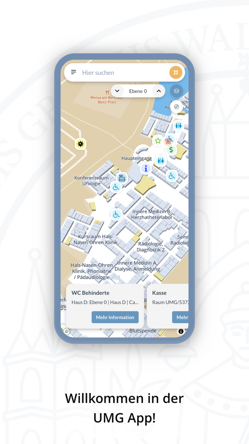 Teilen Sie auch Ihre Station oder den Treffpunkt in der Cafeteria per gängigen Messenger-Diensten mit Ihren Besuchern. Diese können die Navigation sofort starten und auf direktem Wege zu Ihnen finden.