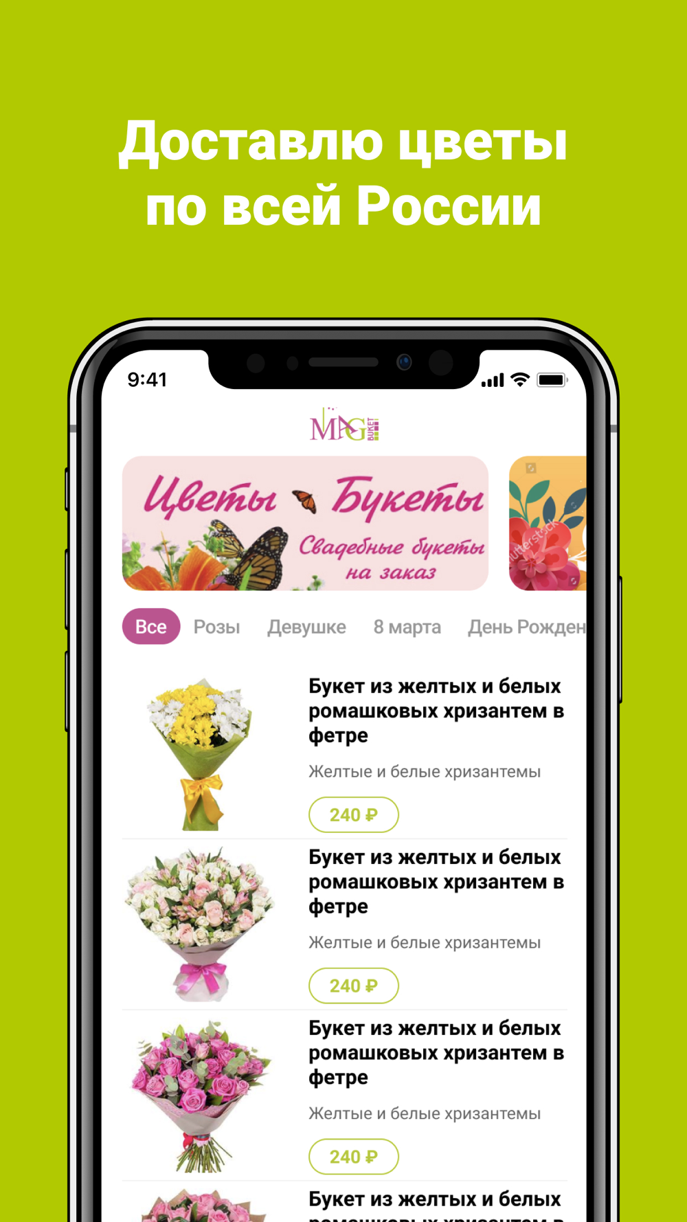 Доставка цветов никогда не была проще – закажите букет цветов в подарок для дорогого вам человека прямо со смартфона! Официальное мобильное приложение сервиса доставки цветов MagBuket поможет вам найти лучшие цветы в подарок. Сервис MagBuket – цветочный онлайн магазин, который обеспечит доставку цветов вашим близким в любой день и время. Купить в подарок пионы, хризантемы, розы или целый букет – лучшее, чем вы можете порадовать любимого человека!