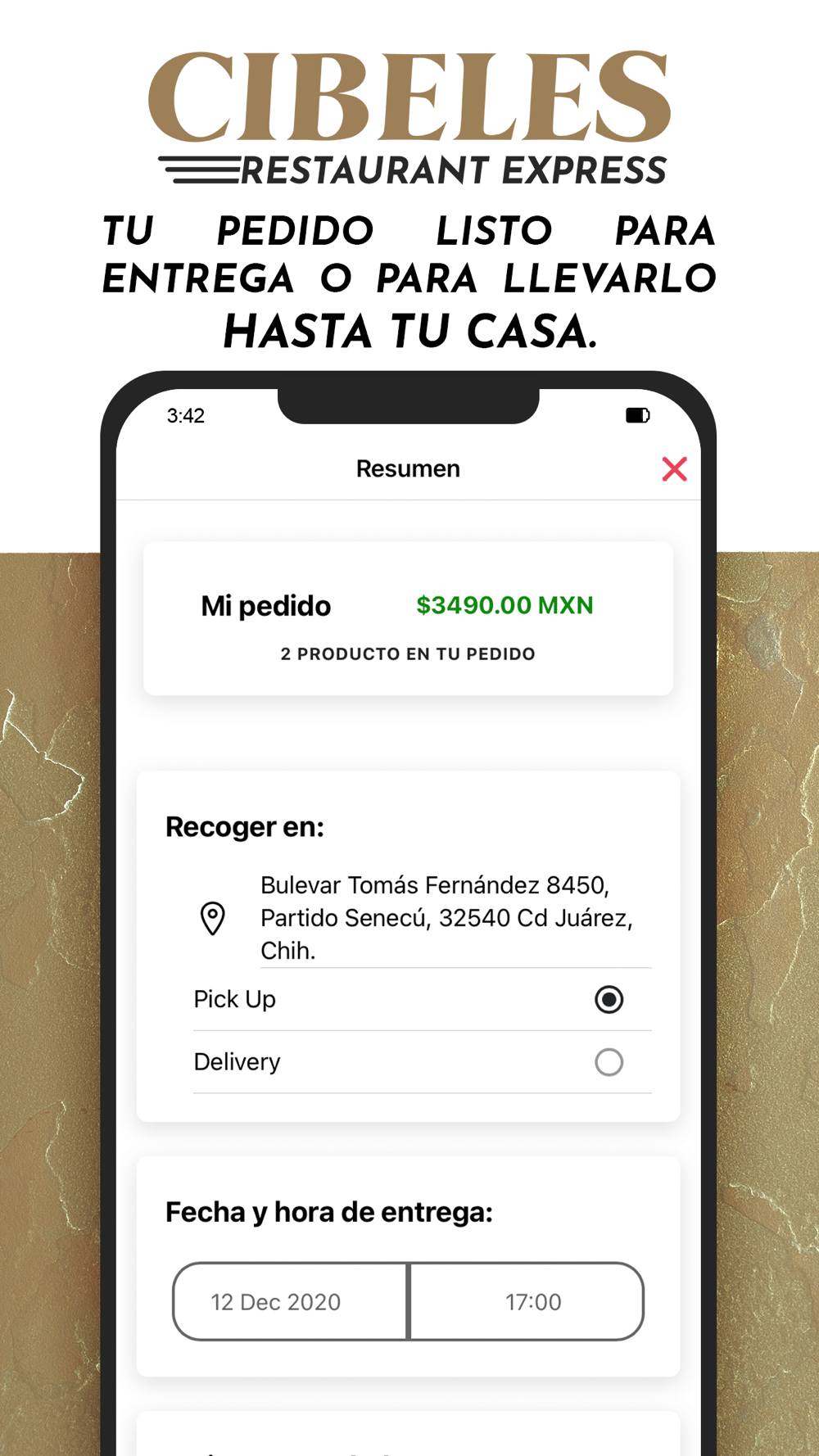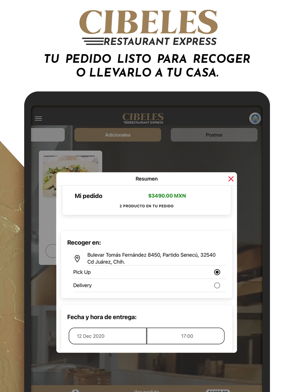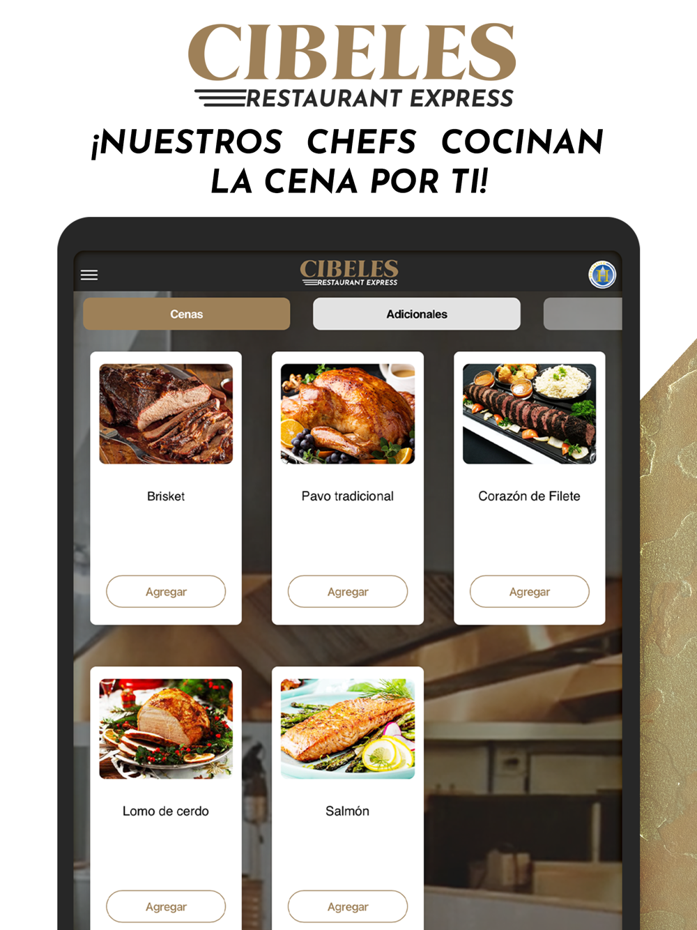 Para CIBELES RESTURANT EXPRESS, disfruta la experiencia de nuestra cocina en tu casa, pide tus platillos favoritos para ti y tu familia, personaliza tu orden con guarniciones y postres, todo de forma rápida y sencilla, y con la elección de recoger en tienda o entrega a domicilio.