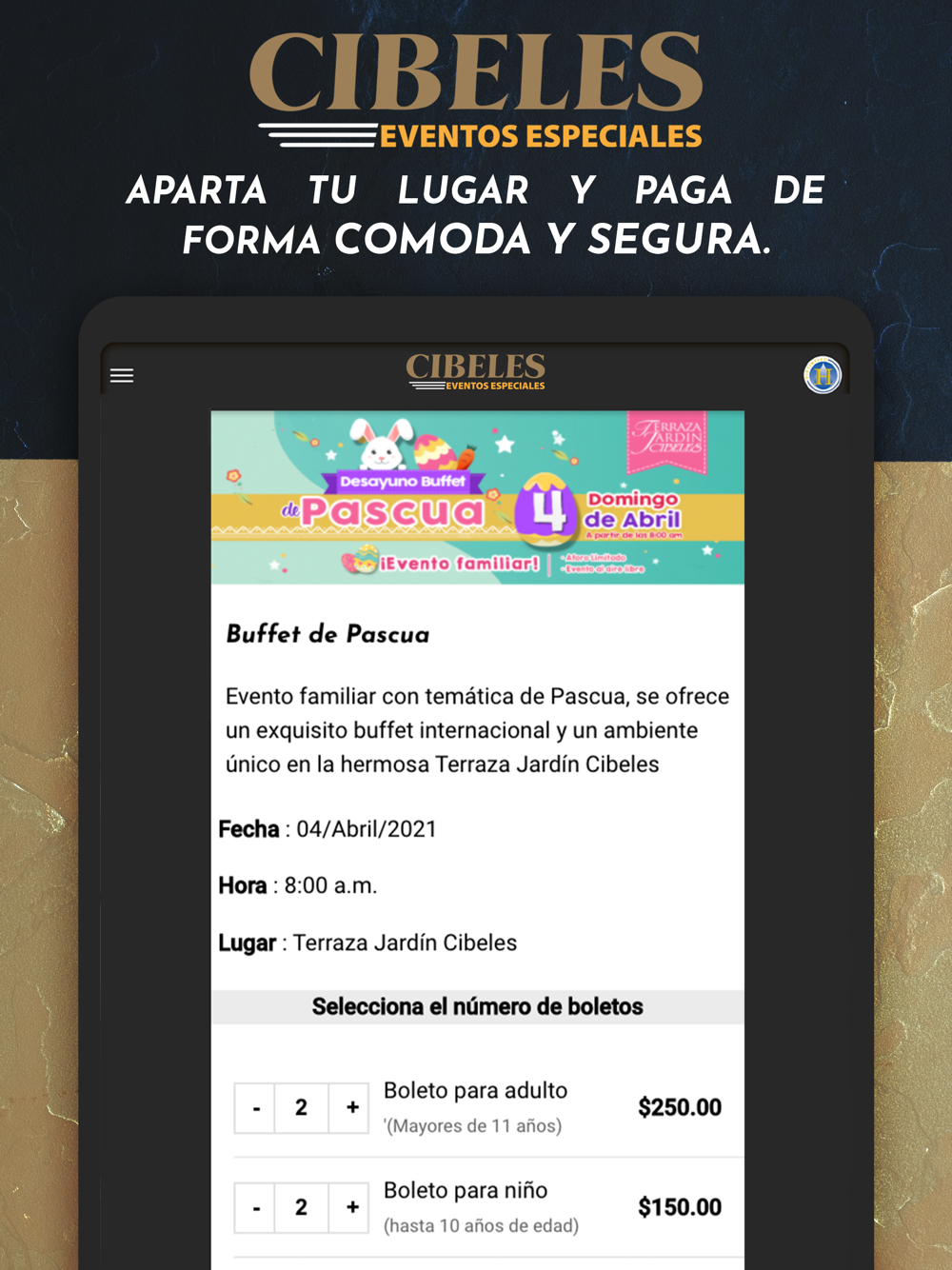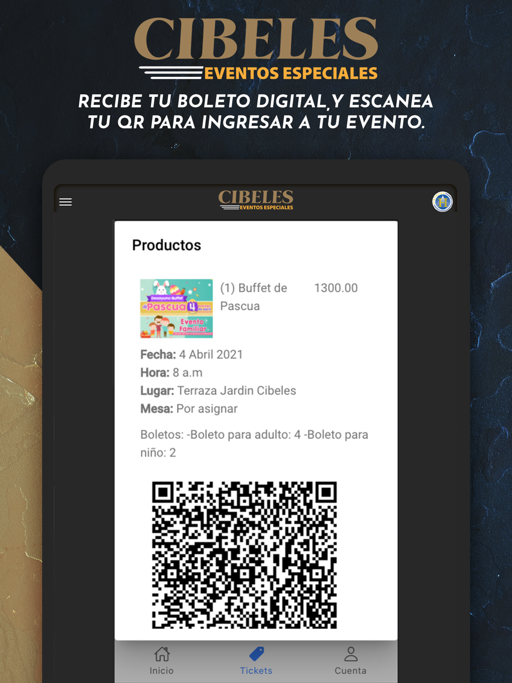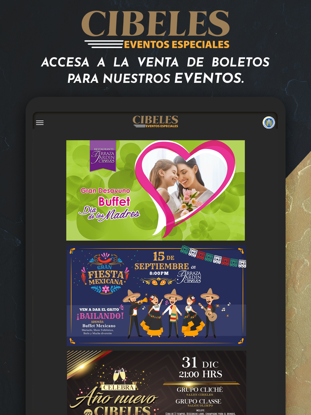 Para CIBELES EVENTOS ESPECIALES, accesa a la venta de boletos para nuestros tradicionales eventos propios de CIBELES, tales como bailes temáticos, comidas, buffets y celebraciones especiales, aparta tu lugar, paga y obtén tu boleto digital, y al llegar al evento escanéalo para ingresar, para que tú y tu familia disfruten del evento sin preocupaciones.