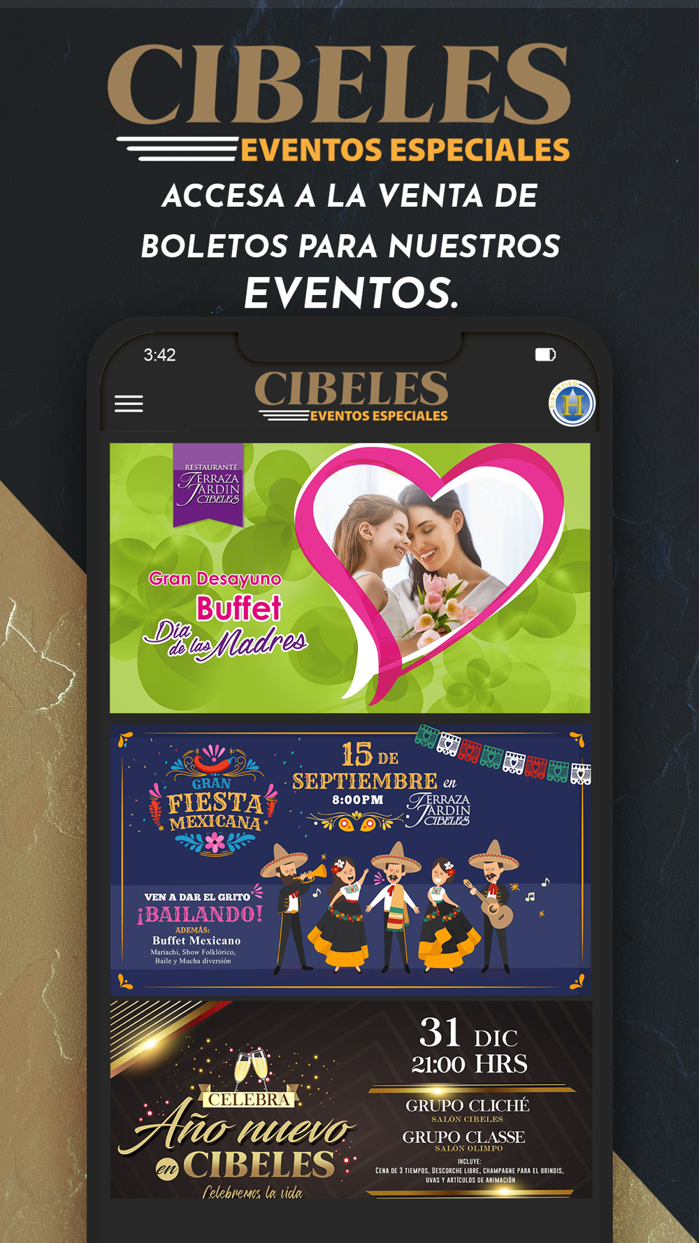 Descarga nuestra app y obtén acceso a CIBELES EVENTOS ESPECIALES y CIBELES RESTAURANT EXPRESS, todo desde tu dispositivo móvil.
