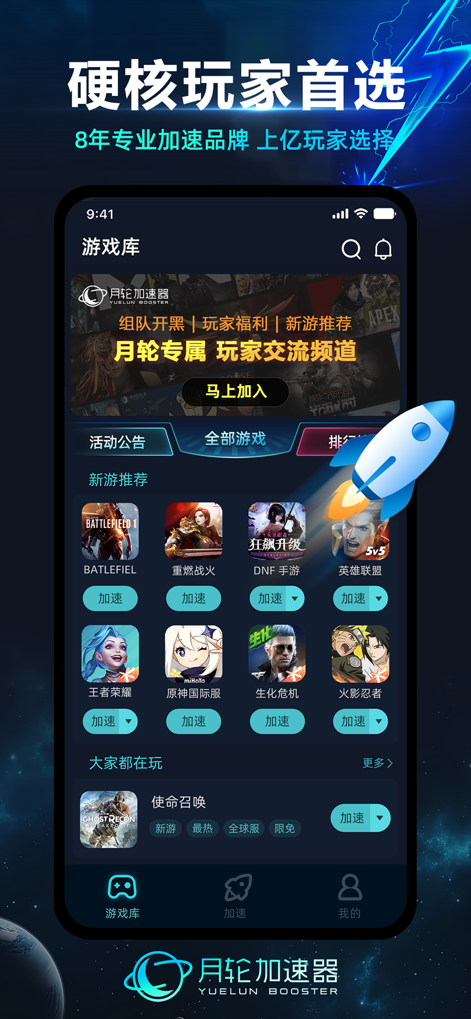 专线加速,电竞级月轮手游加速器,支持PUBG、使命召唤战区、王者荣耀国际服、吃鸡外服、刺激战场、多个海外热门游戏加速
