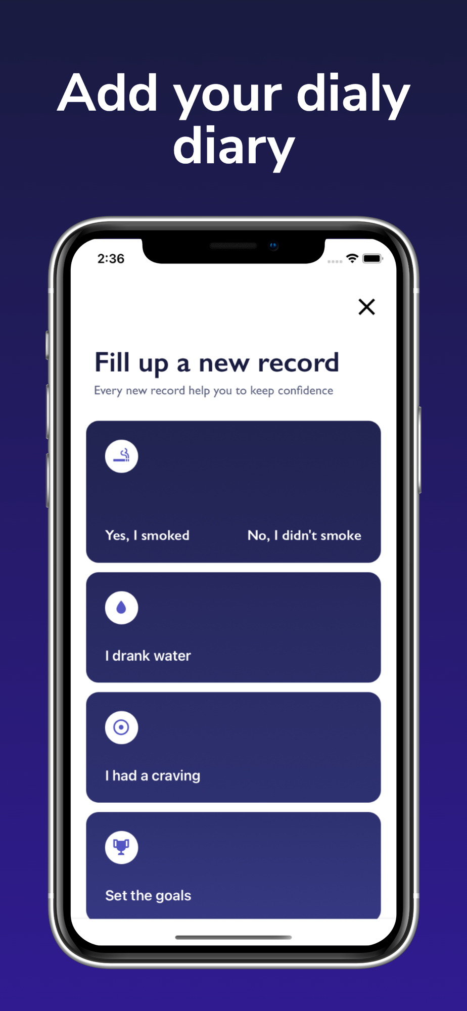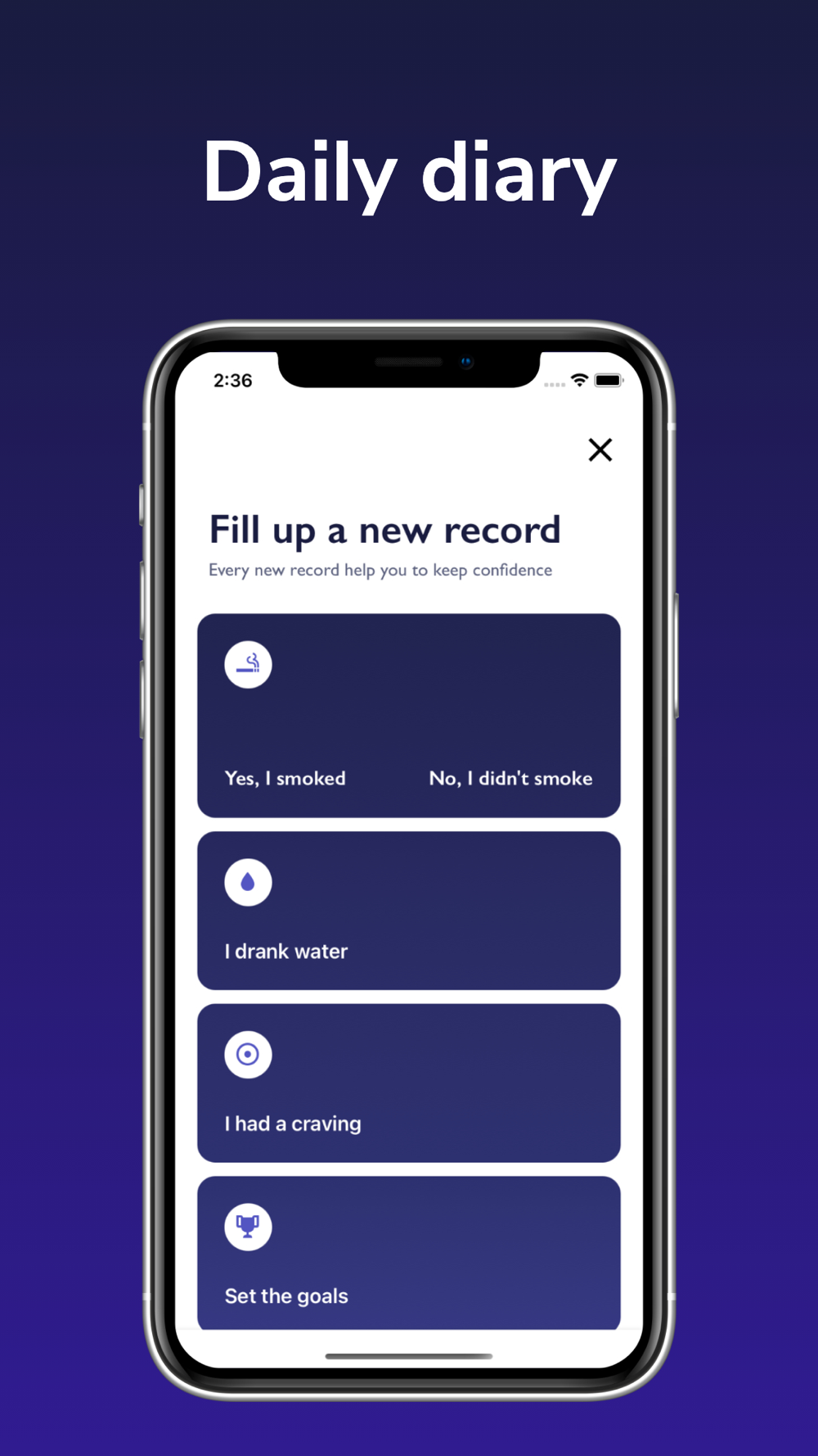 Simply select your quit date and enter your smoking habit details then watch as various indicators display your circulatory and lung function improvements, your savings, and much more.