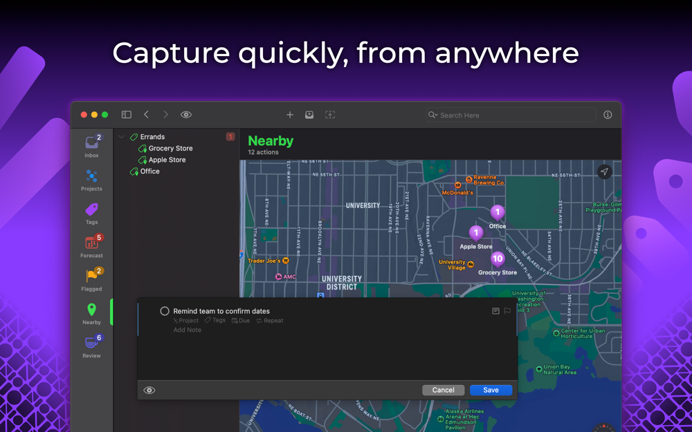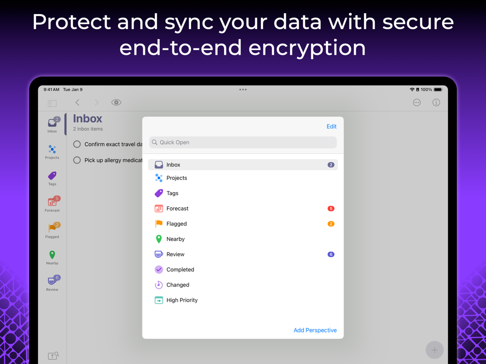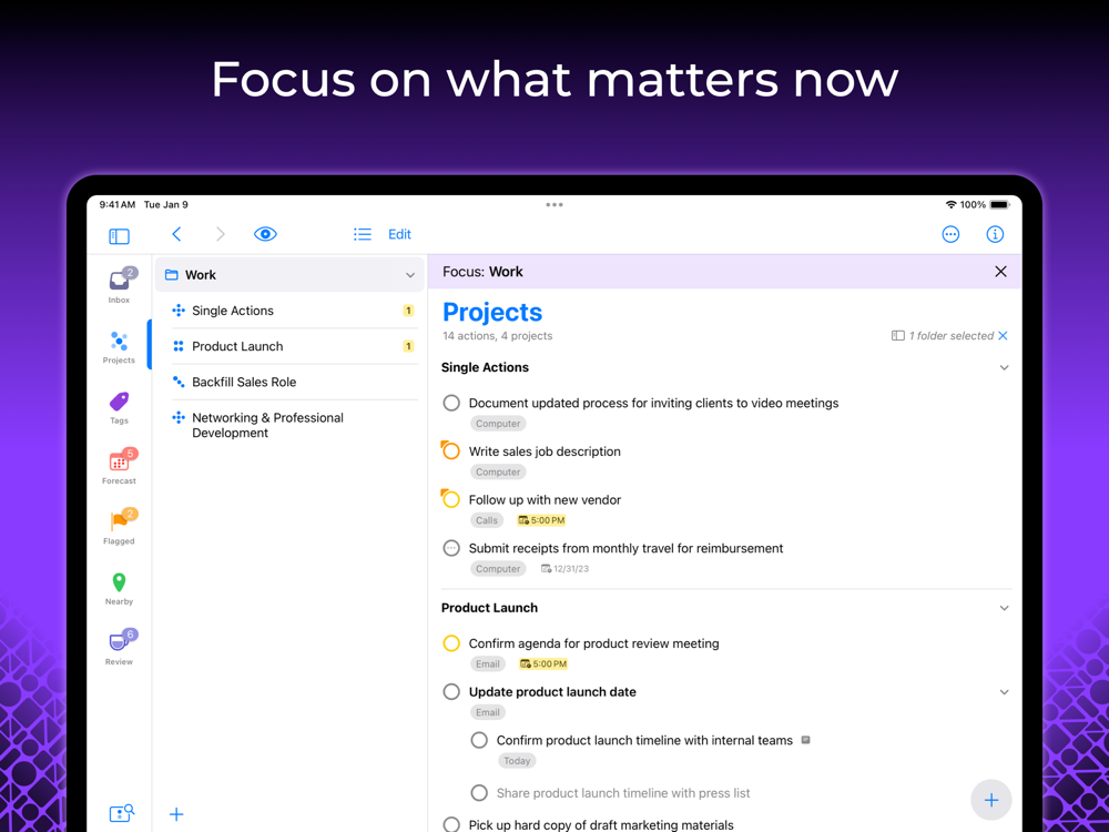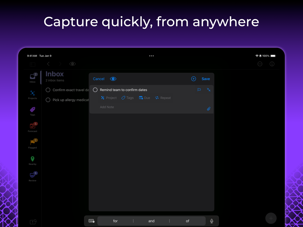 Easily create tasks anytime–from anywhere–and organize them with projects, tags, and dates. Quickly navigate OmniFocus on any device using the Perspectives Bar, Quick Open, and Back and Forward history. With Pro, use Focus to help focus your attention on specific projects or folders, and customize OmniFocus to only display the information most relevant to you.