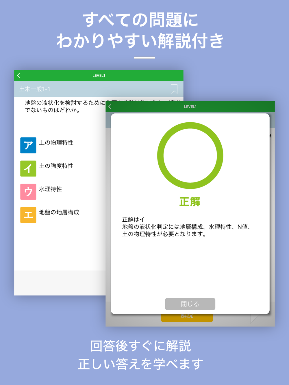 解説も充実し、アプリならではの隙間時間も逃さず効率的に勉強!これで次回試験もバッチリです!